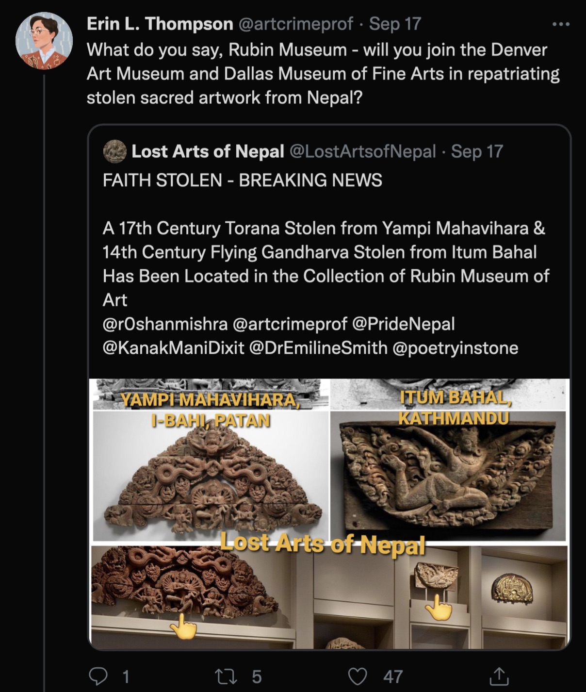 After news broke of the gandharva and torana at The Rubin, Thompson tweeted on 17 September: ‘What do you say, Rubin Museum - will you join the Denver Art Museum and Dallas Museum of Fine Arts in repatriating stolen sacred artwork from Nepal?’