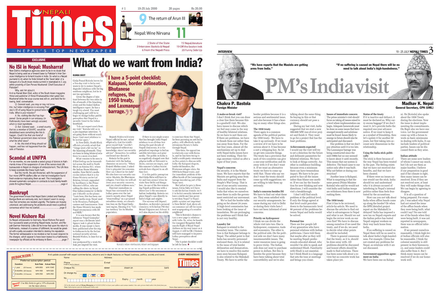 The front page analysis of the first edition looked at the impending state visit to India by Prime Minister Girija Prasad Koirala. Among the contentious issues he was going to take up with Indian Prime Minister Atal Behari Vajpayee: the Kalapani territory occupied by India. The dispute flared again this year, and sank bilateral ties to a new low.