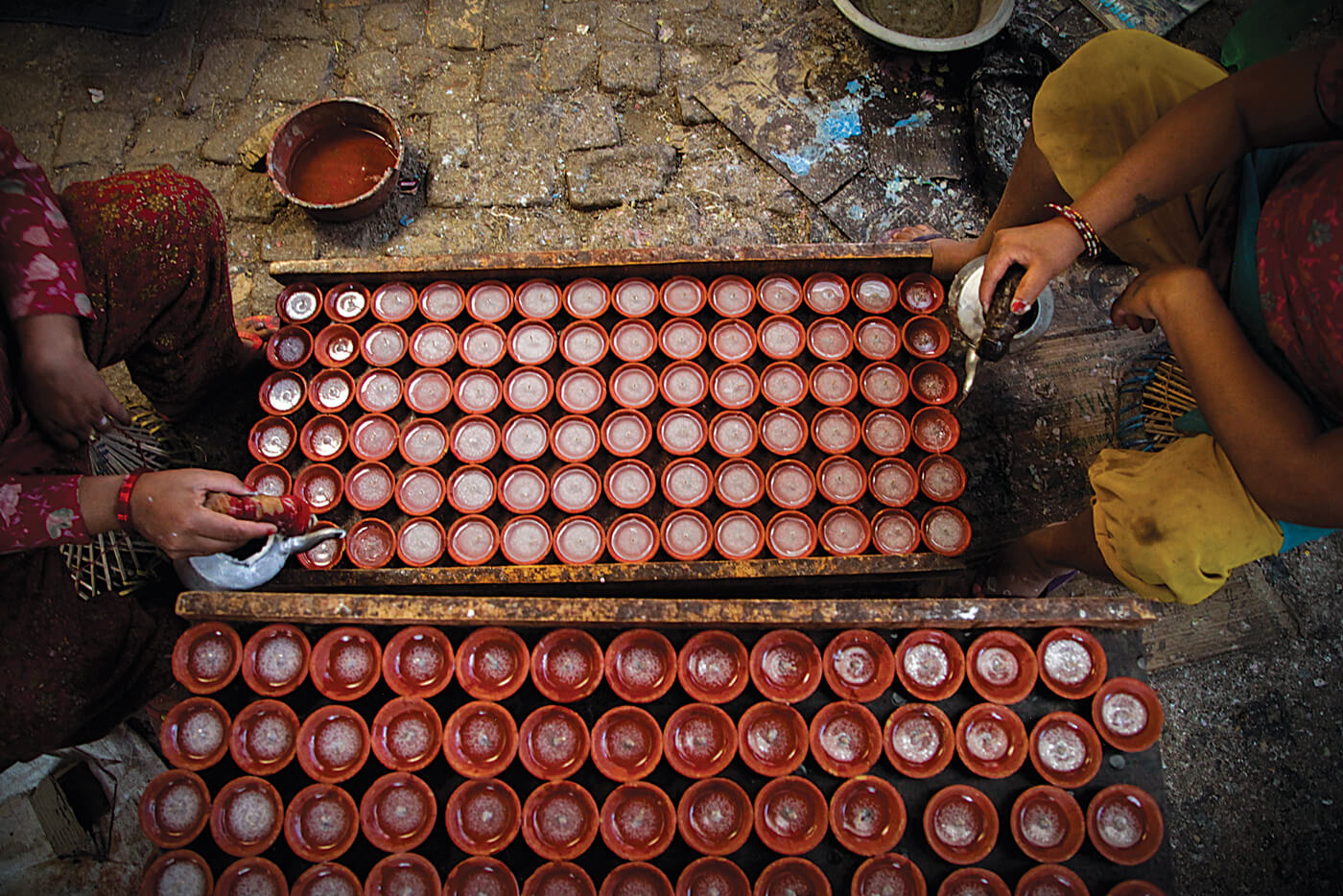 This week, the courtyards and sidewalks of Bhaktapur are covered in clay lamps, soaked in coloured water, and drying in the sun until they can be fired.