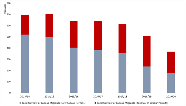 Labour recruiters have been responsible for 88-92% of Nepali workers mobilised annually since 2015. With their business plummeting because of the COVID-19 (see chart), they have been putting pressure on the government to scrap rules that regulate the industry.