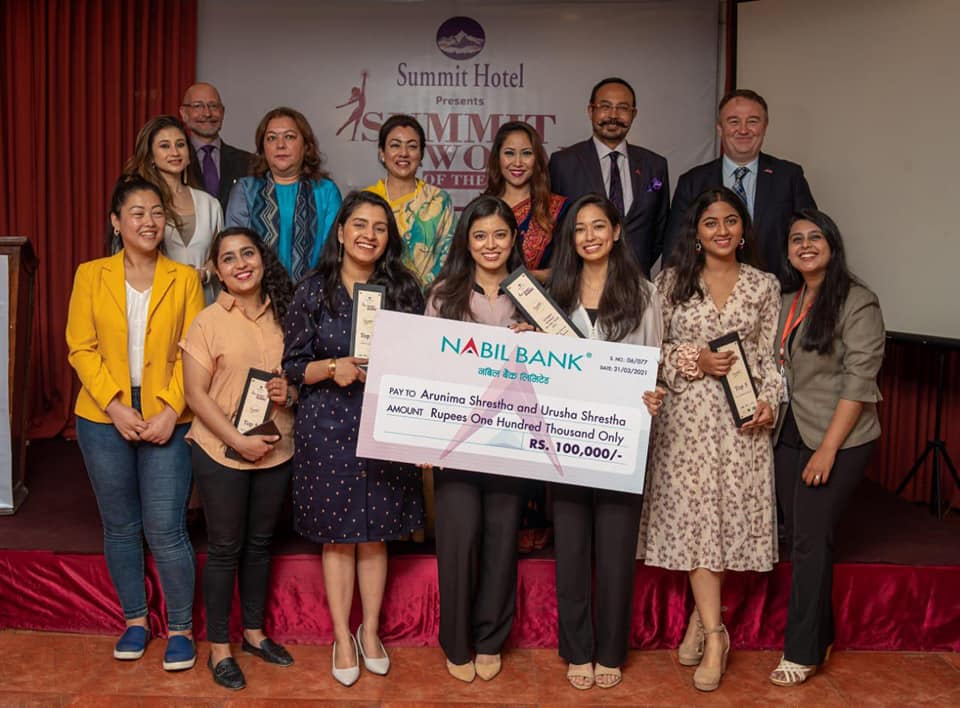 Summit Hotel and Open Space Network jointly organised Summit Woman of the Year 2021 to honour businesswomen below 30 with sound business sustainability plan as well as social impact. There were 160 applicants of which the top five were: Twinkles by Jaya Rajbhandari, Leklekk by Yajaswi Rai, Tittofritto Foods by Arunima Shrestha, Earn Infinity by Aditi Goyal, and Pure Joy by Binita Pokharel.