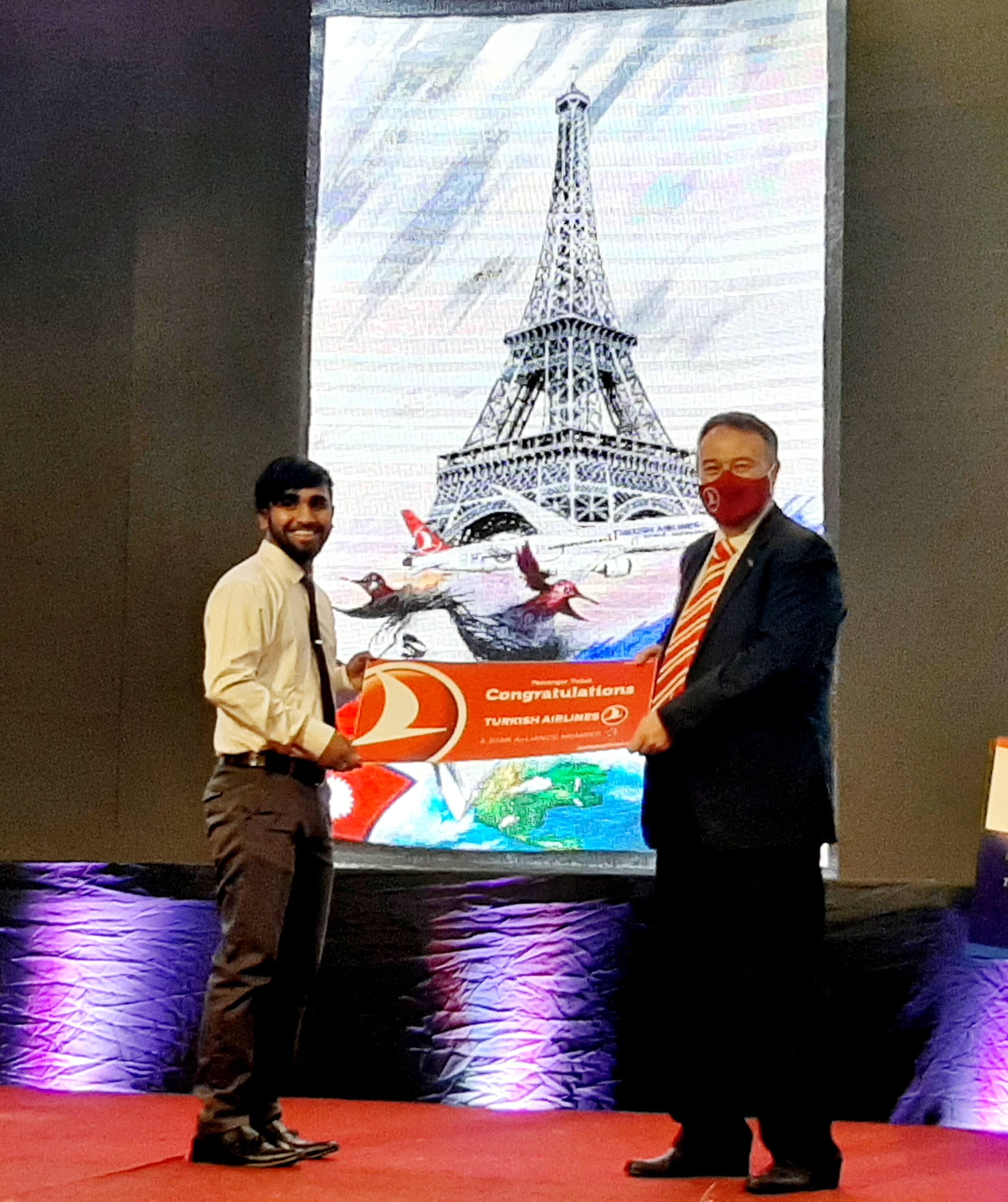 General manager of Turkish Airlines for Nepal Abdullah Turner Kececi handed over an air ticket prize to the winner of the Turkish Airlines art competition Subham Sah, organised by Glocal Skill Week. The art competition highlights students’ talents and promote reflective and critical thinking regarding visual arts.