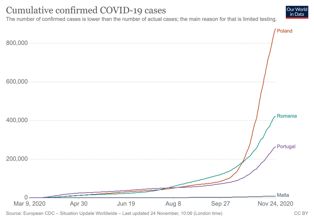 Most European countries are going through a second wave this winter, and cases have exceeded 16 million with 371,419 deaths. So far, Poland has seen 876,333 cases, Romania 422,852 cases, Malta 9,137, and Portugal 264,802 cases.
