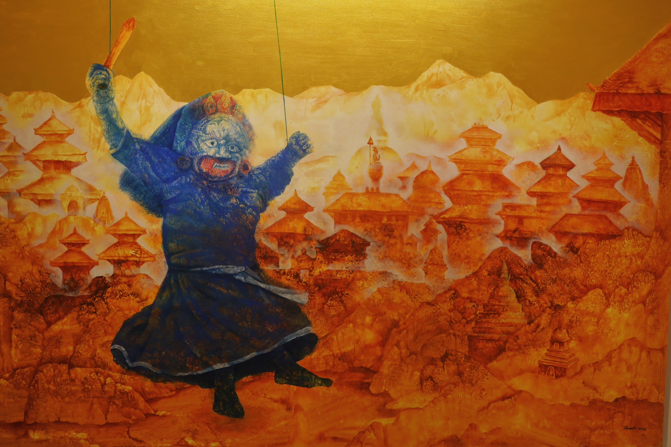 Pradhan, who painted most of the 'Sacred Realm' art during a Covid quarantine, obtained relief from all the negative news through art. He recalled and transferred the blue-green landscapes he witnessed in his 2016 Annapurna Circuit Trek into canvases.