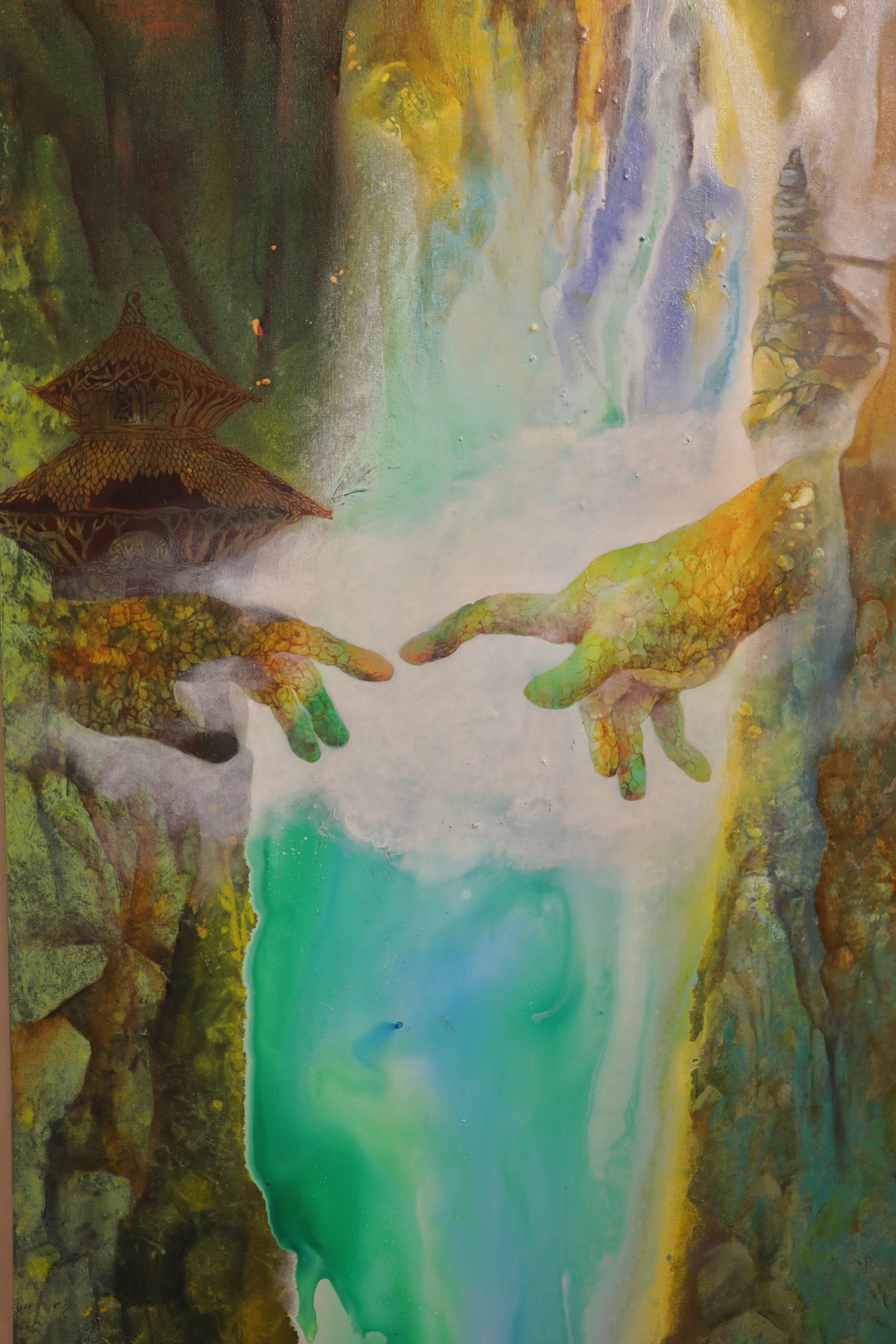 On either side, a temple and a Chorten stand aloof on top of mighty mountains. The connecting hands might also portray the harmony between Hinduism and Buddhism in Nepal. Pradhan grew up with merging influences from both, and he communicates his nostalgia with surrealism, smearing watered-down white acrylic as clouds to create a dream-like haze.