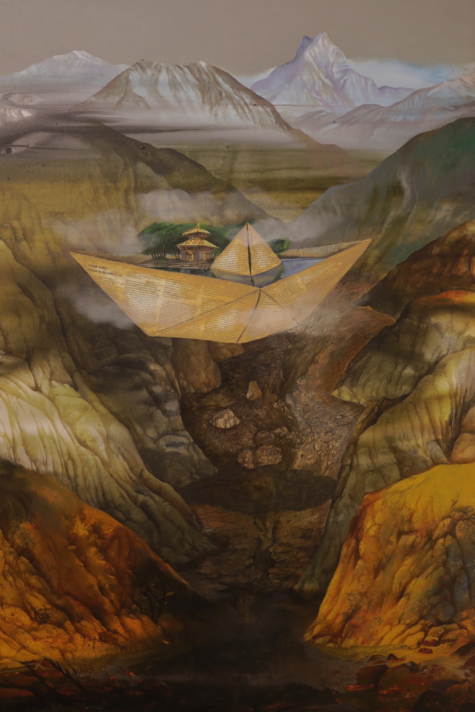 The muddy remains of a dried-up Fewa Lake is patiently layered acrylic in Fewa Lake Existing, and one can almost smell the lake bed. Inspired by an article about the shrinking of Fewa lake, he painted the gorge empty of water. Sapanako Dunga (Boat of Dreams) holds the Barahi temple in the composition as the climate threat and uncontrolled development tarnish the lake. Safe to say, he embraces intertextuality and intergenericity.