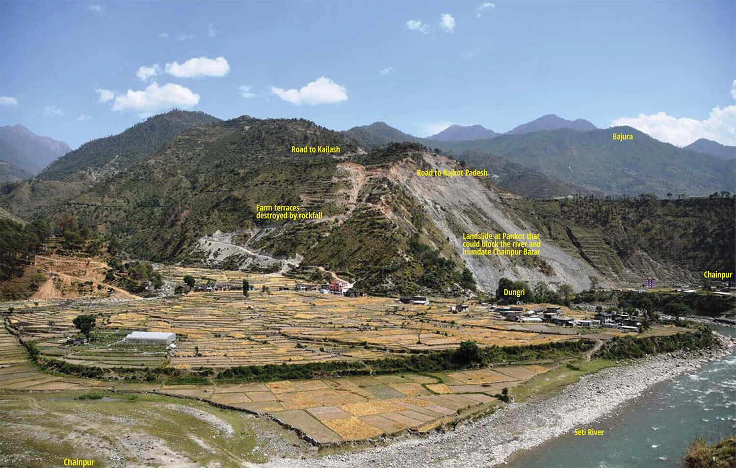 In all, 10 people have been killed by raging floods since April in this area of Bajhang that has seen much road-digging. The crop damage has been extensive, and pushed many farmers in this already food-deficit region to the brink of starvation.