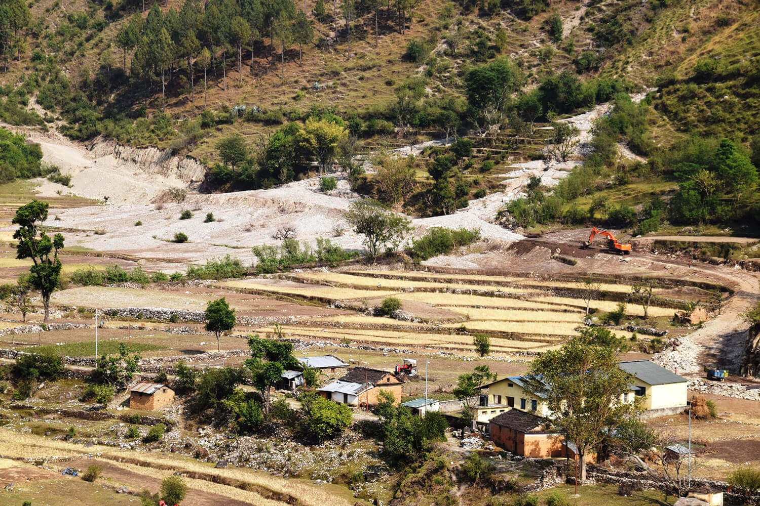 Subeda village (pictured below) once had the district’s most fertile farms, and its 30 or so families were well off. But most of its farms have been destroyed by rocks and boulders tumbling down the mountains from a road alignment. The contractor, Lama Golden JV, shows no remorse.