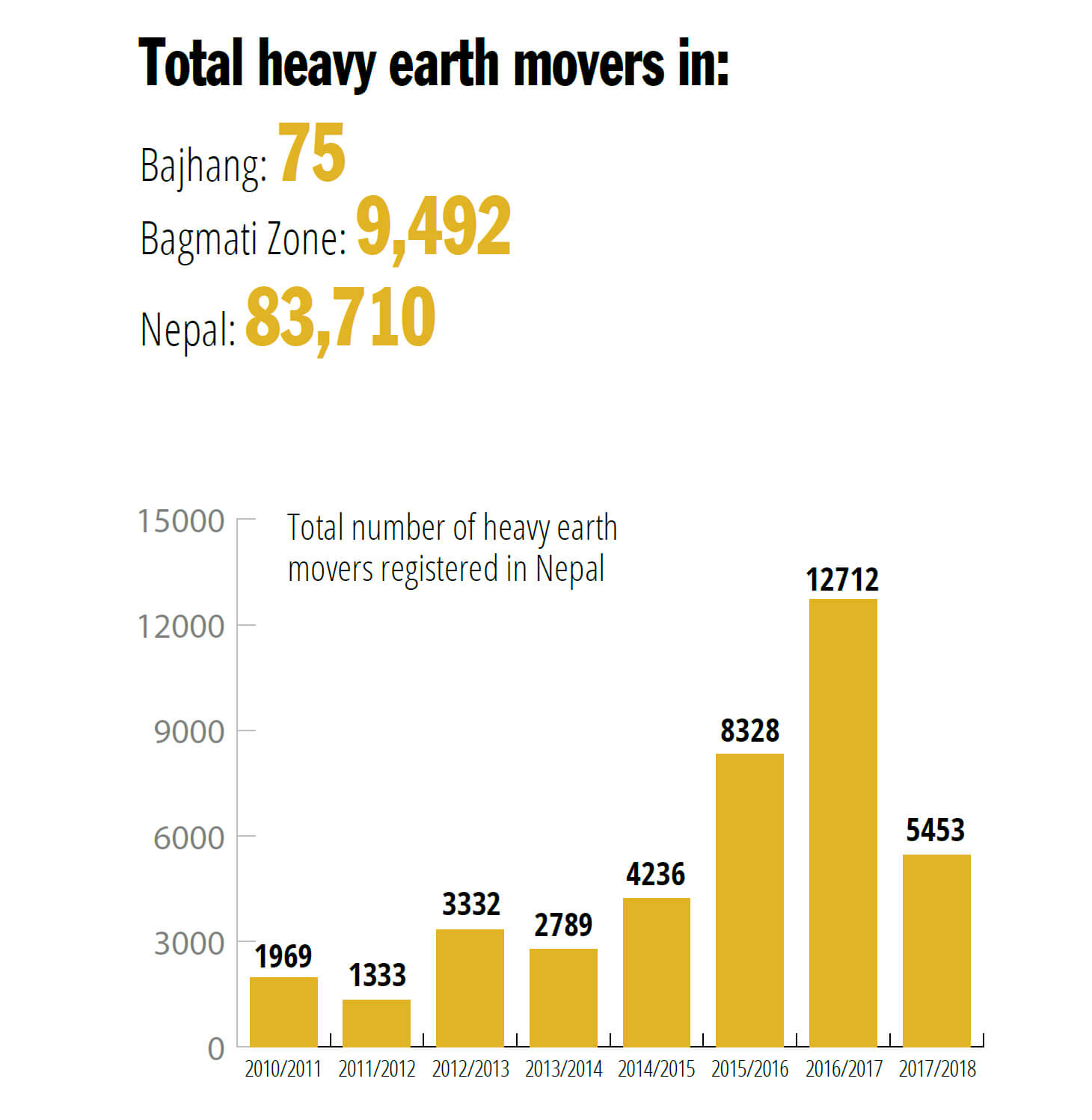 Finding details about new roads nationwide is impossible. Even the Department of Roads doesn’t have proper records. Bajhang district authorities have no idea where roads are being built, but unofficially we tallied at least 165 currently under construction. There are more than 75 heavy earthmovers in Bajhang alone.