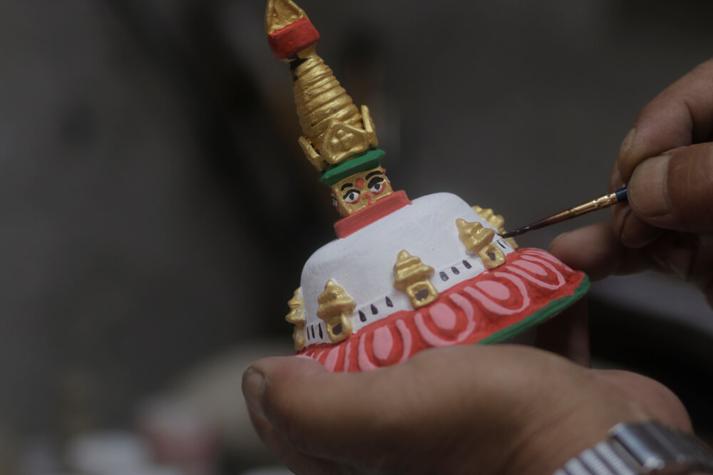 “Sitting idle makes me feel sick,” says 70-year-old Juju Ratna Tamrakar, for whom art and sculpture-making have been a life-long passion. He makes cute little stupas and dharma chakras for sale at Aji’s.
