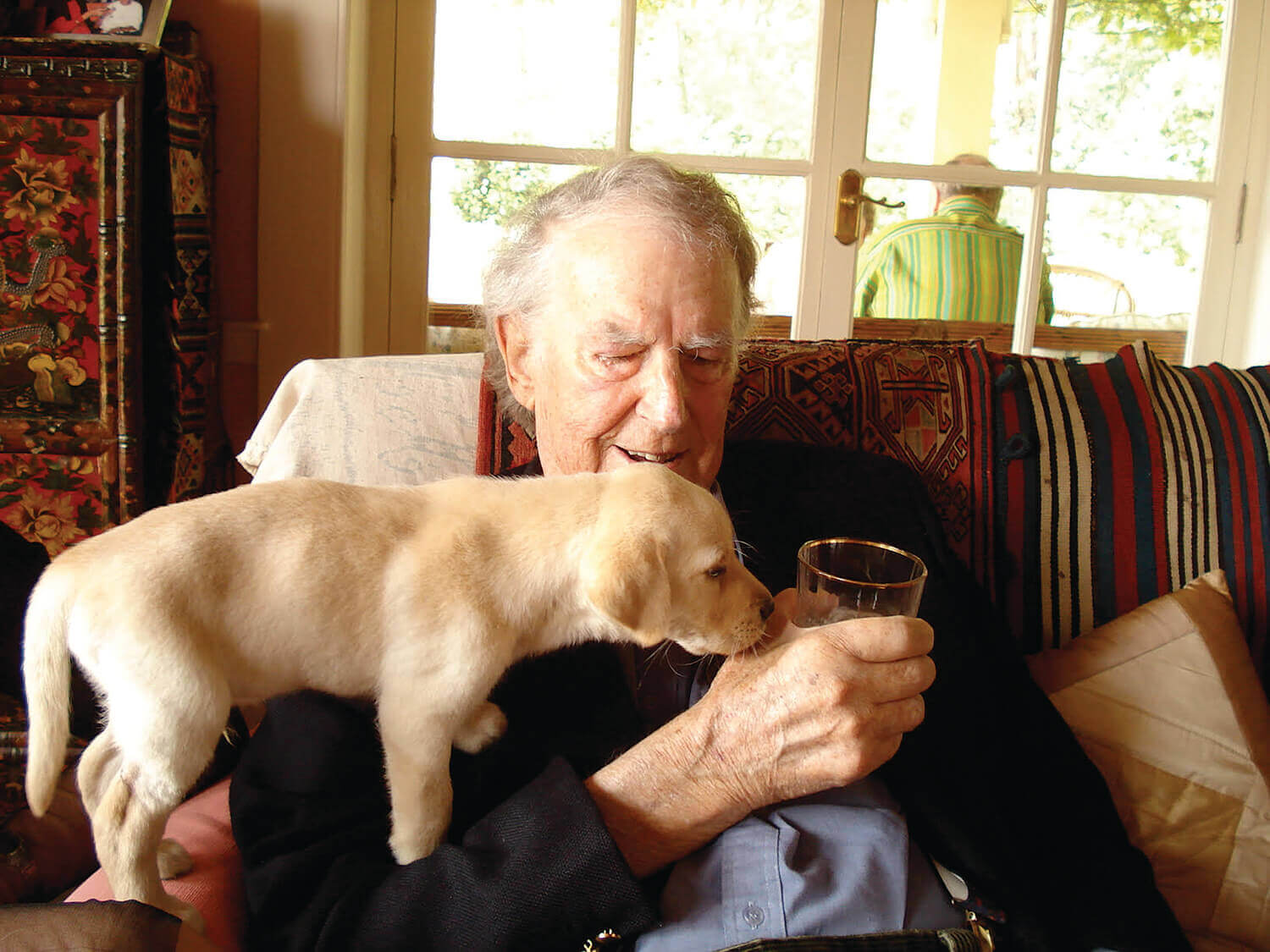 But I like to remember his shy ragged grin, the baggy corduroys, a gentle giant reclining during his latter years in the huge brown leather armchair in his Auckland home, surrounded by books and Himalayan mementos. Often one of Lady June’s cats would perch on his knee, and during the last of his many regular visits to Nepal my Labrador puppy strayed onto his lap on my Kathmandu sofa (pictured above).