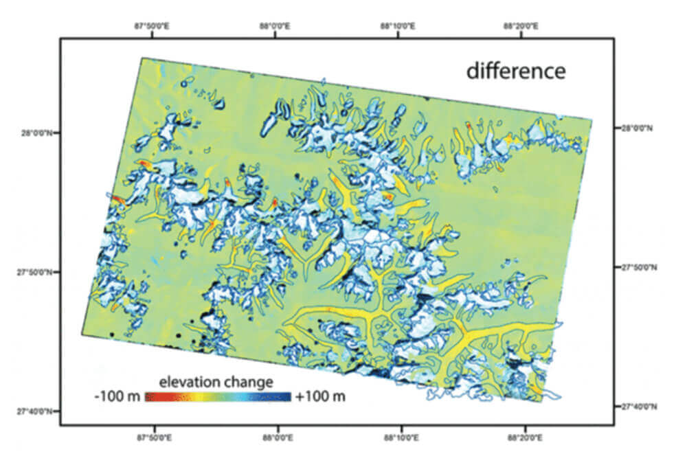 Comparison of satellite images taken in 1975 and 2007 of the Nepal-India border reveals changes in the elevation of glaciers. Alison Corley / Lamont-Doherty Earth Observatory