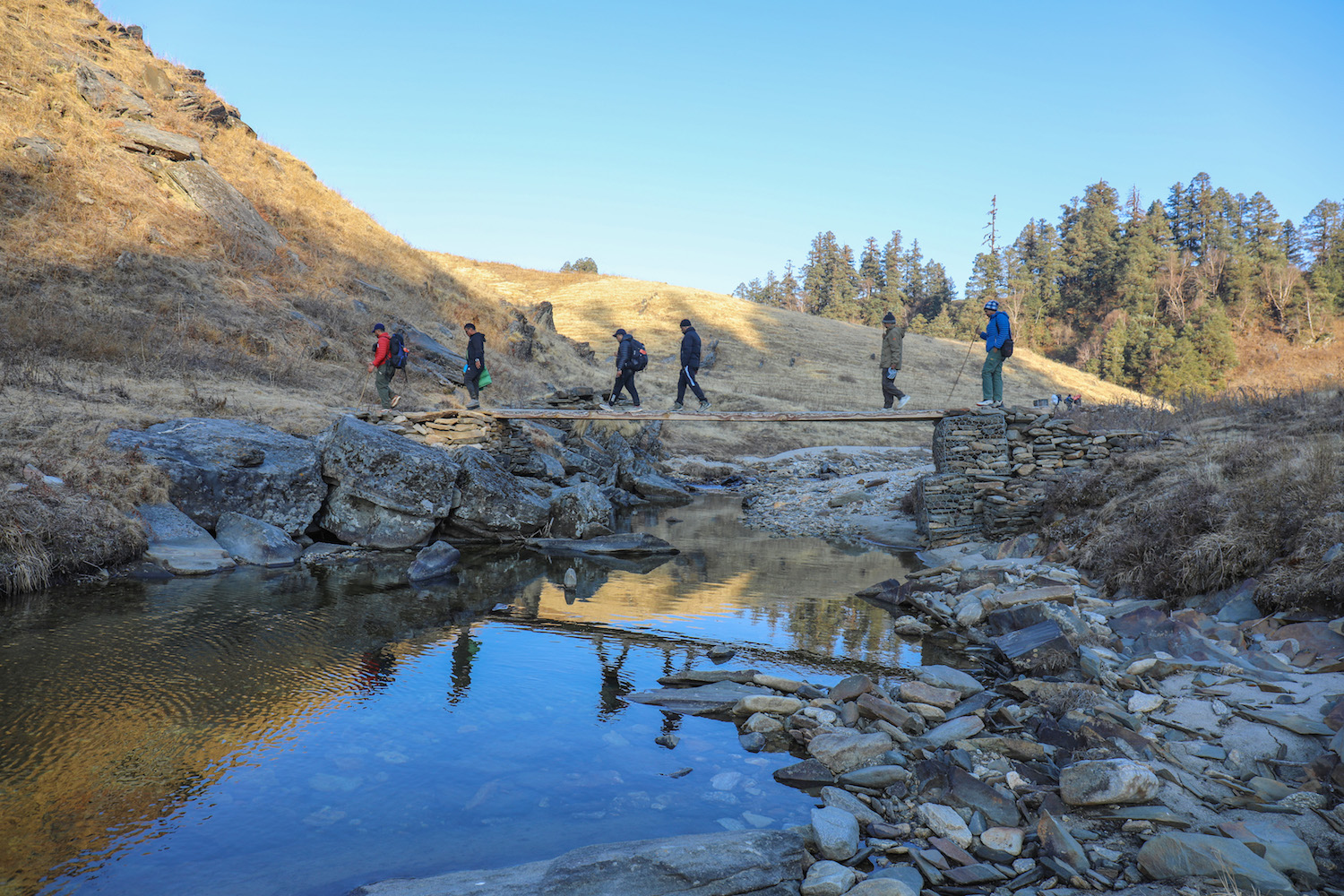 The next morning it is a four hour walk through thick forests alive with birds to Ghodadaun from where there are spectacular views of Mt Api and Mt Saipal in Nepal and Trishul and other mountains of the Indian Himalaya. Nearby is the tranquil Khaptad Daha with mirror-like reflection of the forests.