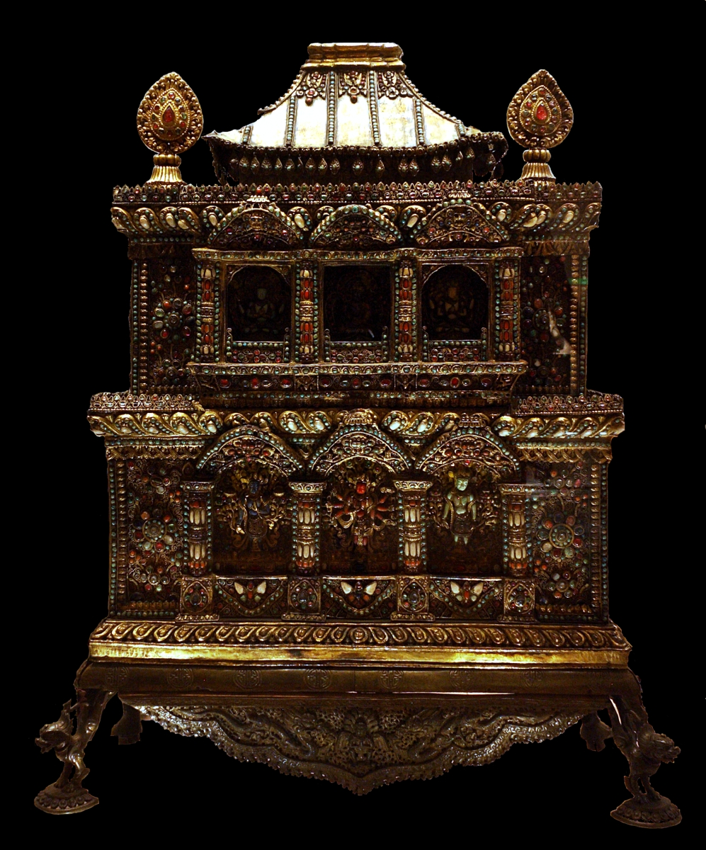 Among the items was an ornate 70.5cm tall two- storeyed Buddhist shrine richly decorated, inlaid with precious stones, gold and silver. Three standing bodhisatva were placed in niches on the lower level, and there were three other deities inside the upper chamber.