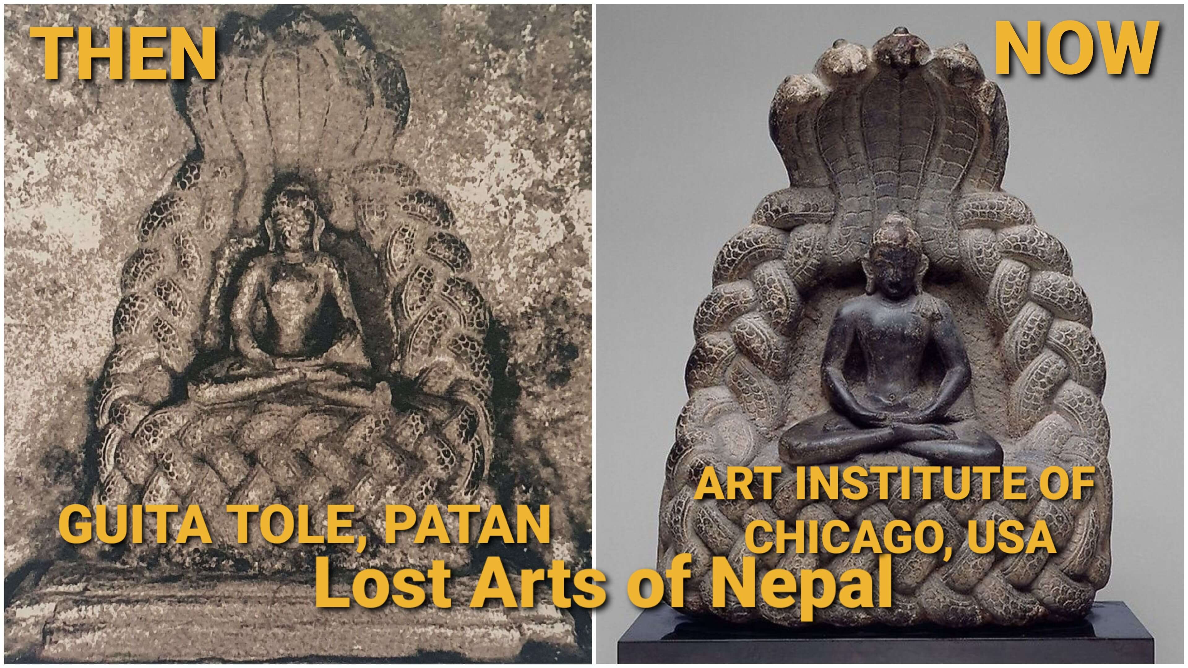 One is a Muchalinda Buddha statue from Guita Tole in Patan, where the first photo of the figure in the shrine was taken by the Department of Archaeology. The second is of a dancing Bhairava which was documented in a book by art historian Jurgen Schick.