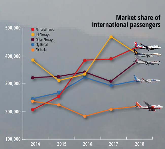 The coordinated attacks coincide with the airline finally showing signs of a turnaround. In 2018, Nepal Airlines became the number one international carrier with a 12% market share, outpacing Jet Airways (see graph).