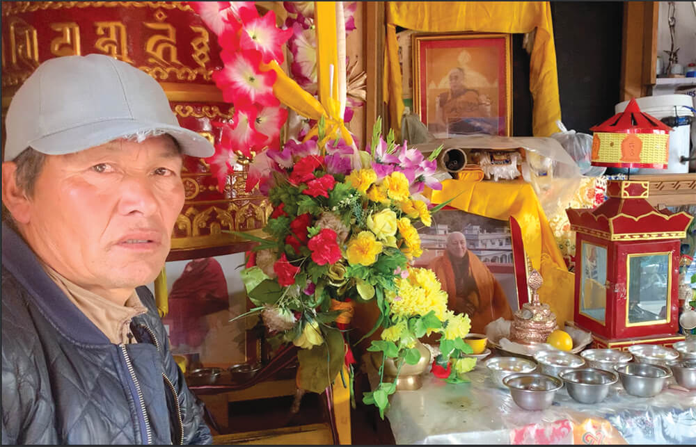 Alone in his empty Panorama Guest House, Karma Tamang sits by a shrine in his dining area with photographs of his wife, son and nephews who perished in the disaster.