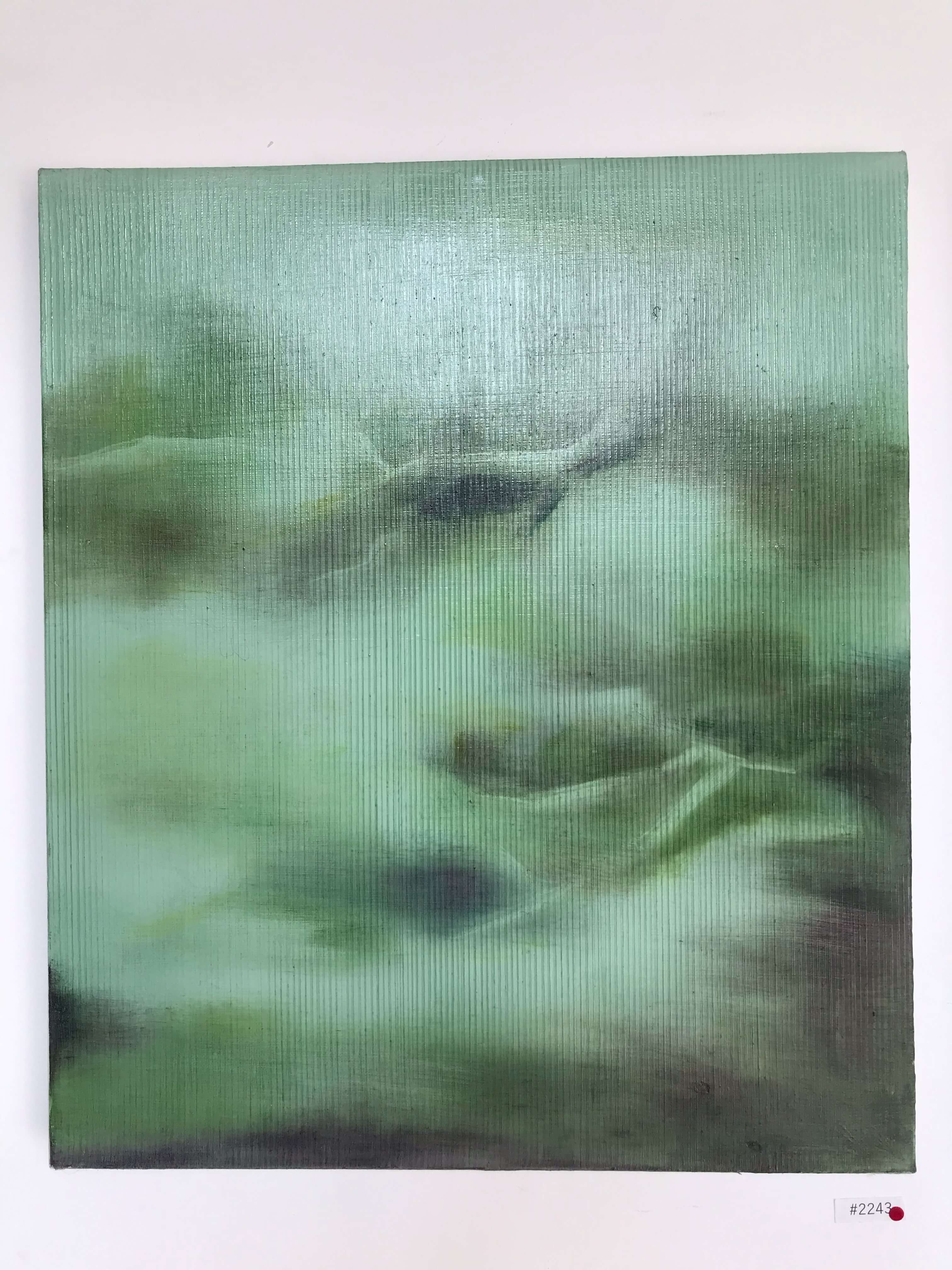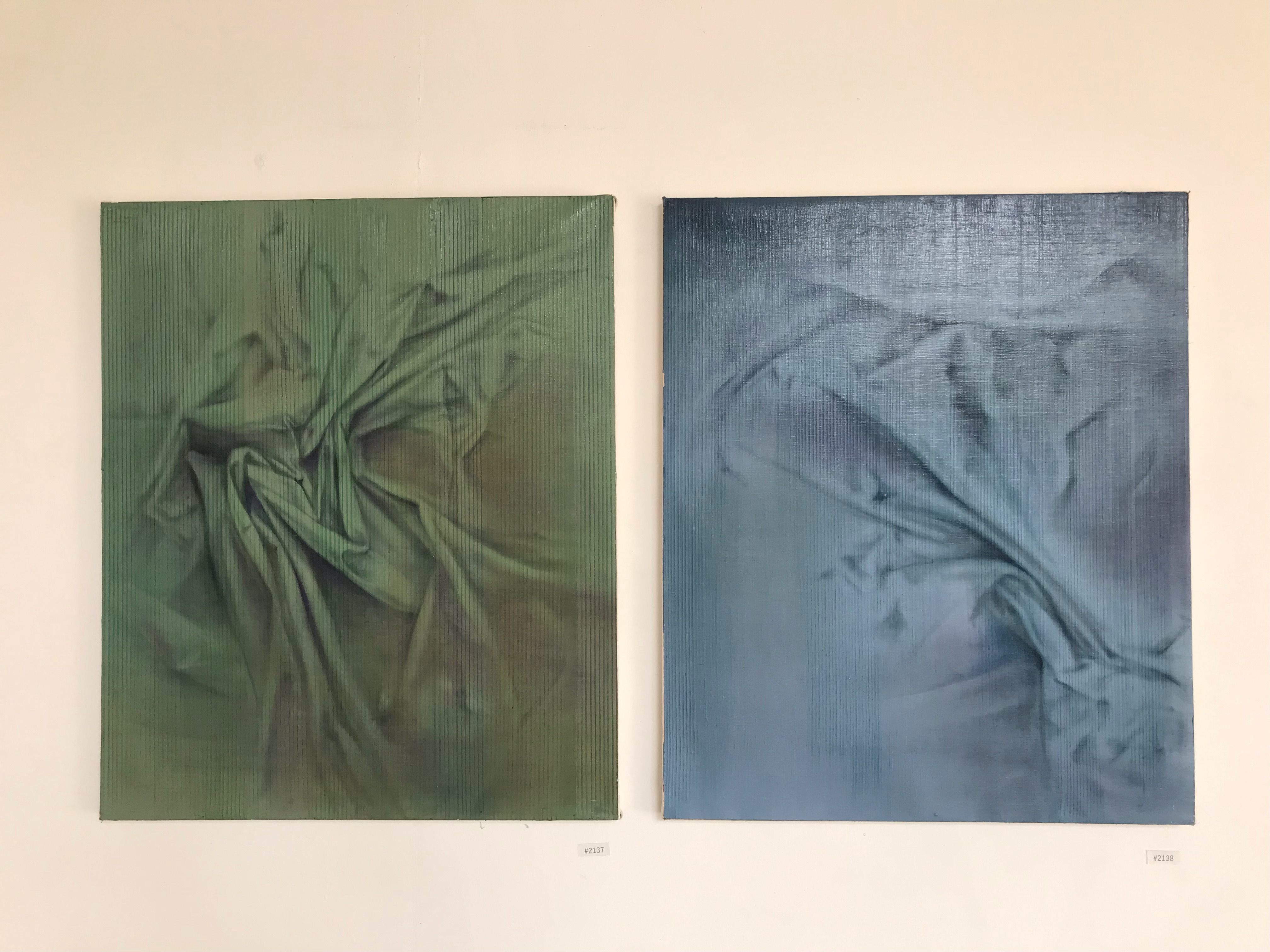 The landscape is reminiscent of Nepali countryside, at various turns of seasons. One painting looks like hills amidst a thick layer of mist seen through a green lens, while several canvases share a crumpled and knotted motif -- like bedsheets early in the morning. The angles and the movements remind one of sleeping or dancing bodies, and are hypnotic and sacred, delicate and at once enduring.