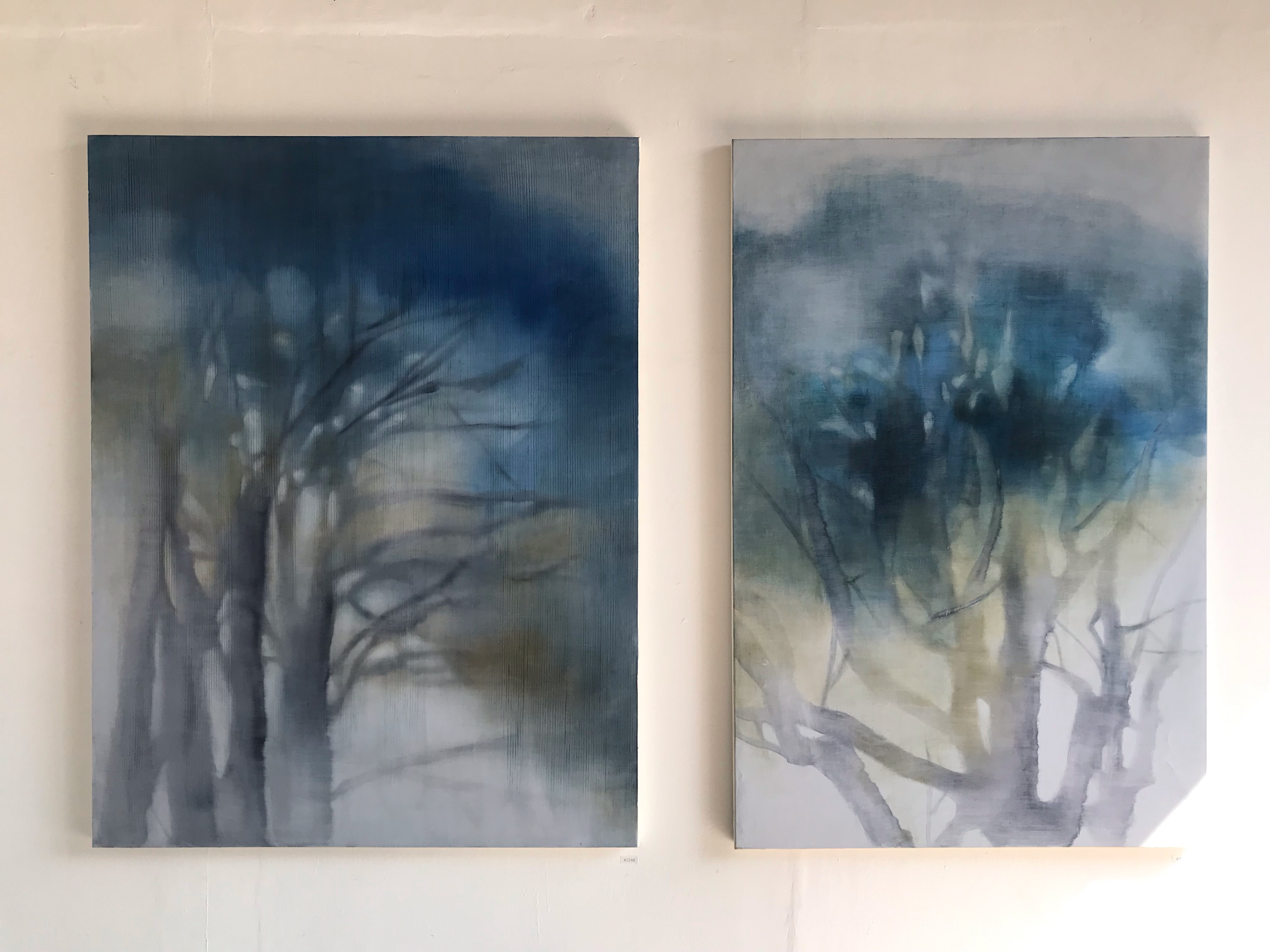 Next to it is its sibling: branches, or perhaps roots upside down, that progressively diffuse upwards in a stream of blue in many shades. Nature is prominent here, with paintings that represent solitary, strong trees against an exploding dawn, or reflected on pools of water.