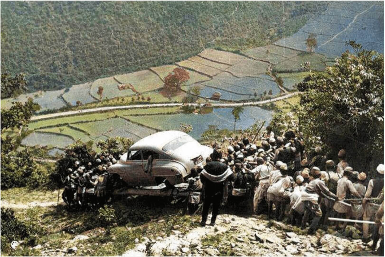 The famous photograph of porters struggling to carry an automobile down from Chitlang Pass into Kathmandu during the Rana period. Original: Unknown/Madan Puraskar Pustakalaya