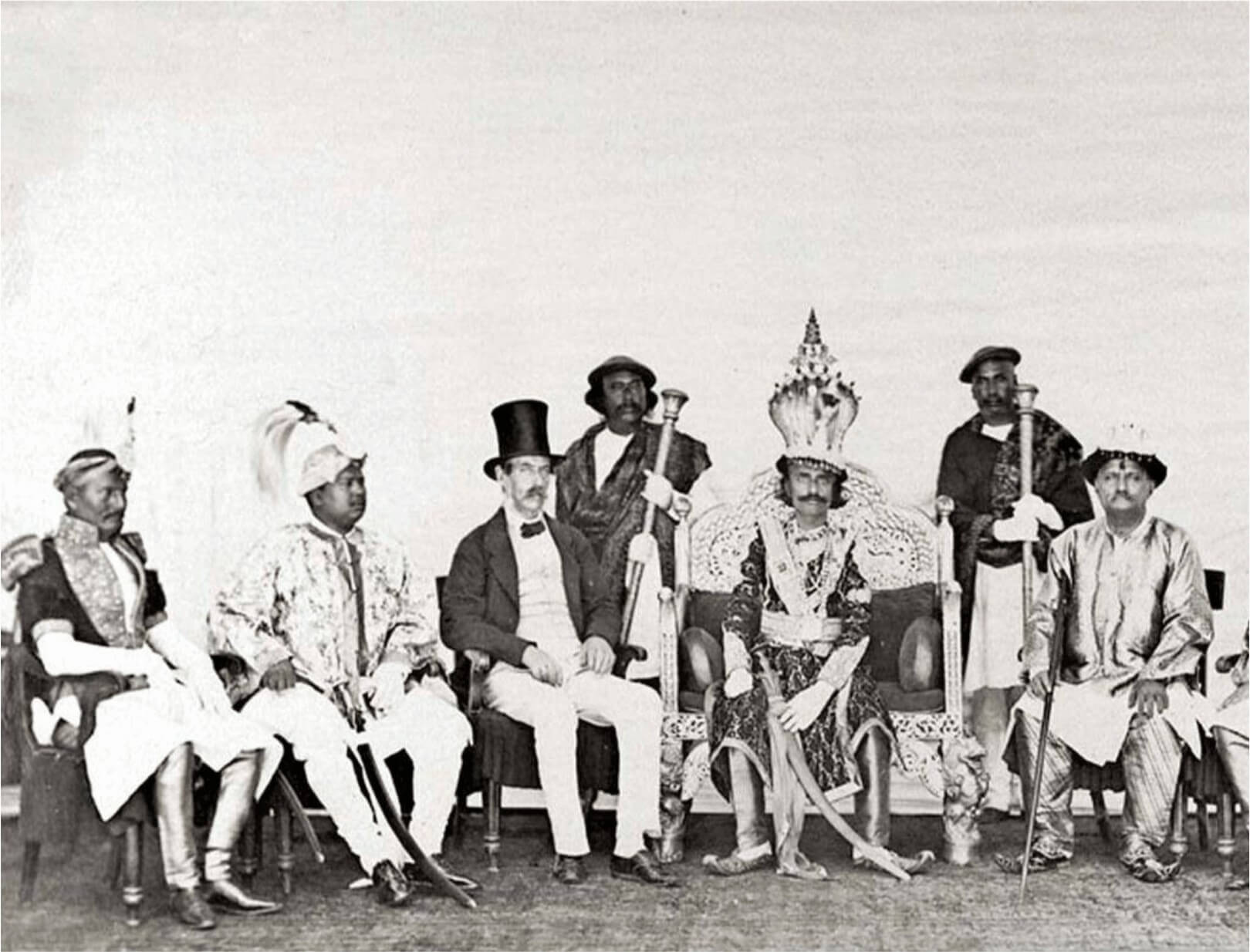 One of the earliest photographs taken in Nepal. King Surendra with courtiers and a visiting British dignitary 150 years ago. Photo: Clarence Comyn Taylor / Madan Puraskar Pustakalaya