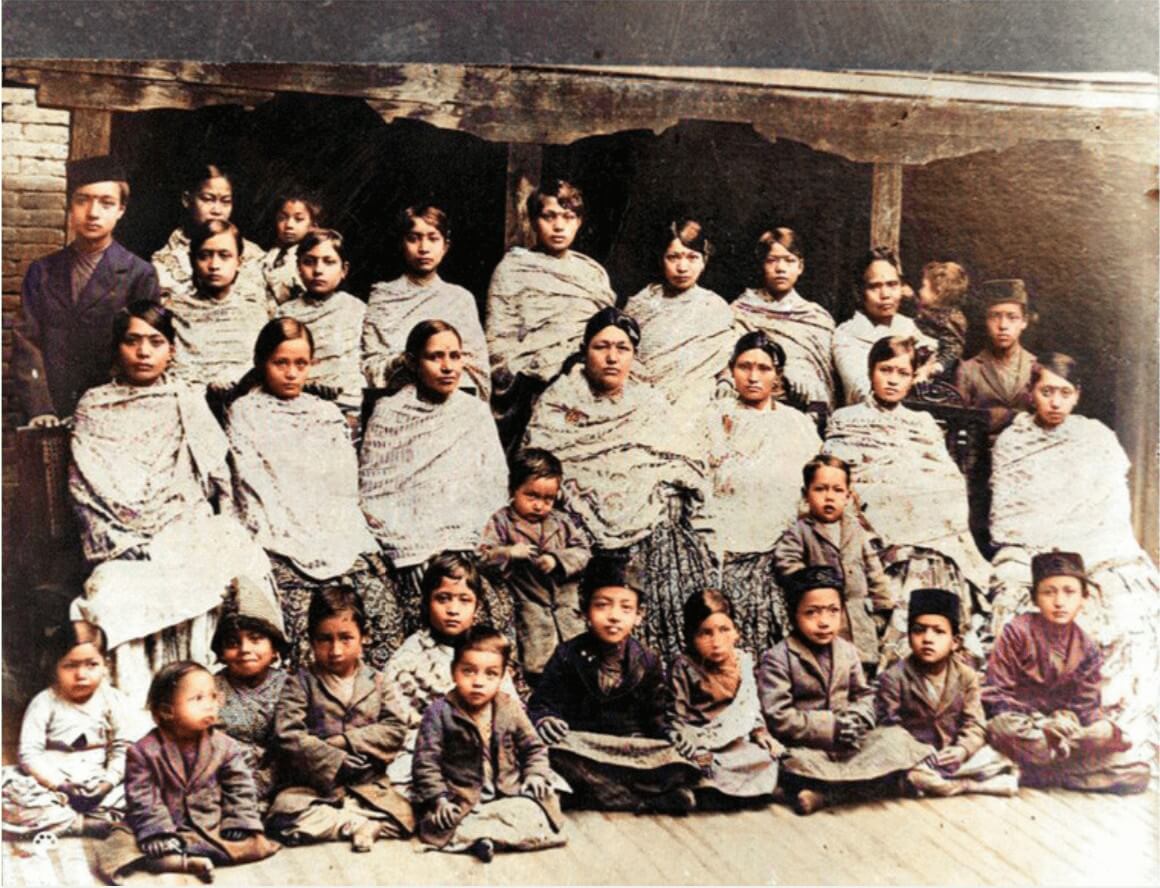 Women and children from the Kaji Narayan Bhakta Mathema household at Om Bahal in 1930. Original: Mukunda Bahadur Shrestha / Nepal Picture Library