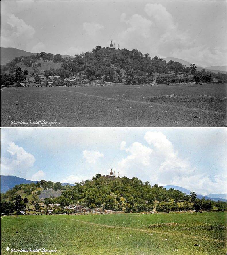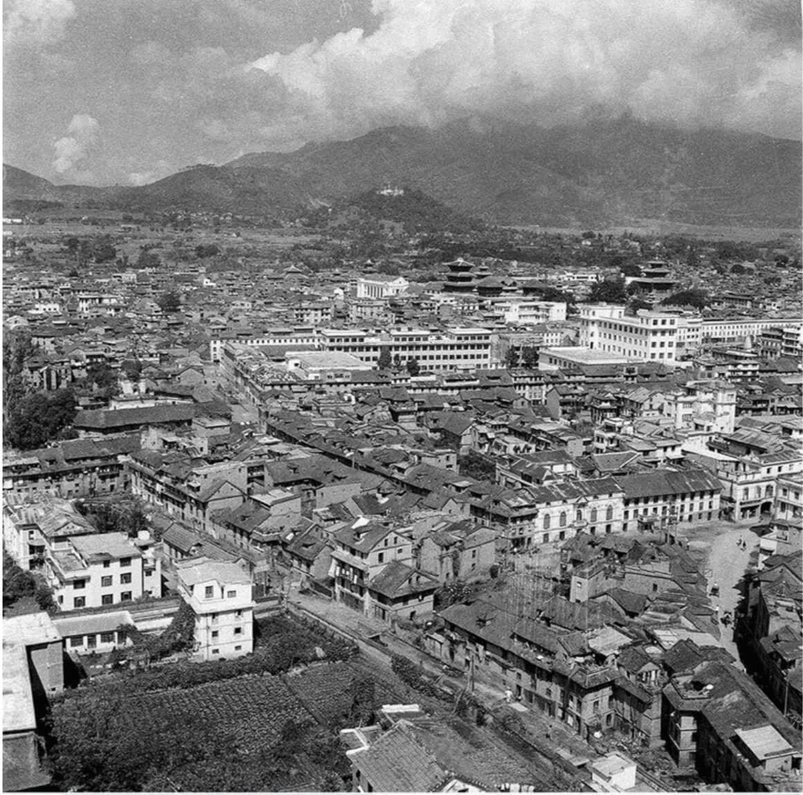 Kathmandu Valley looking northwest from Dharara Tower in the 1960s with Darbar Square and Swayambhu. Original: Mukunda Bahadur Shrestha Collection / Nepal Picture Library