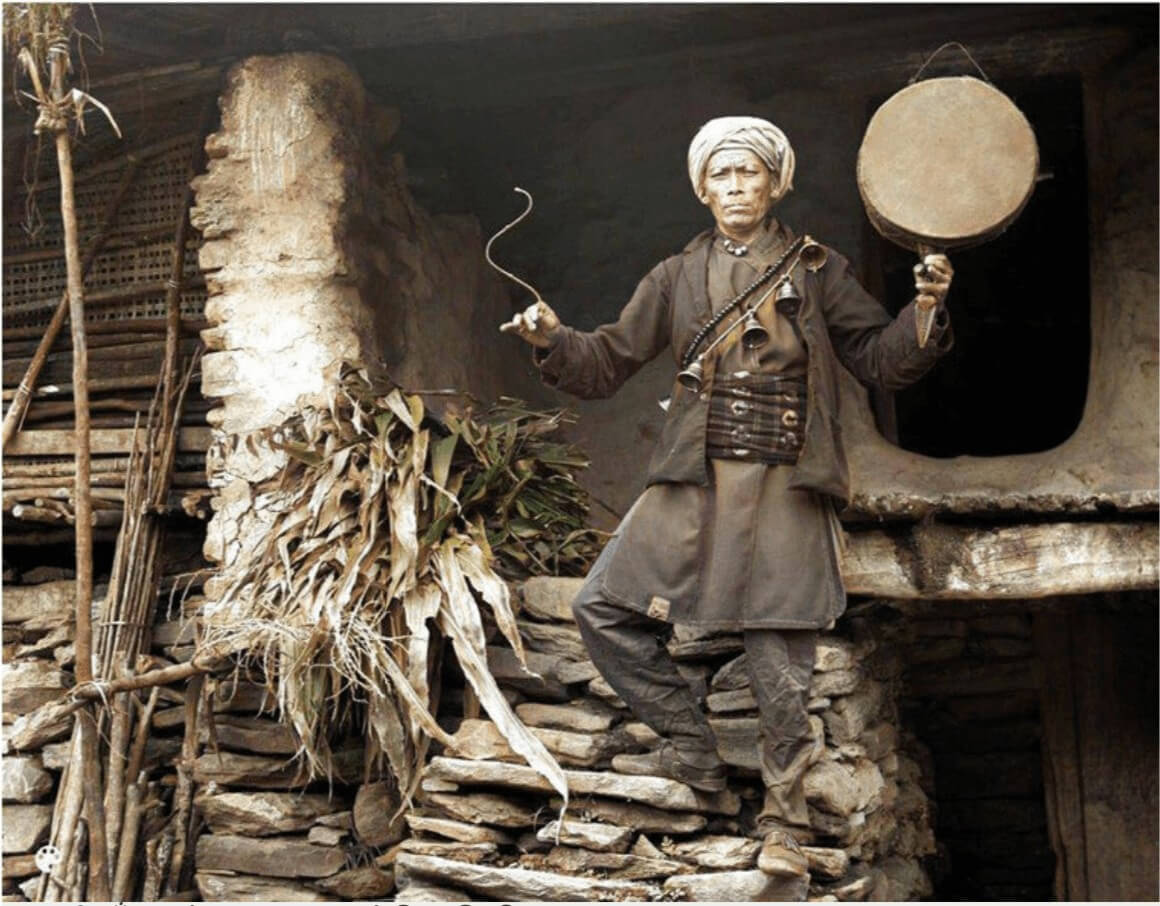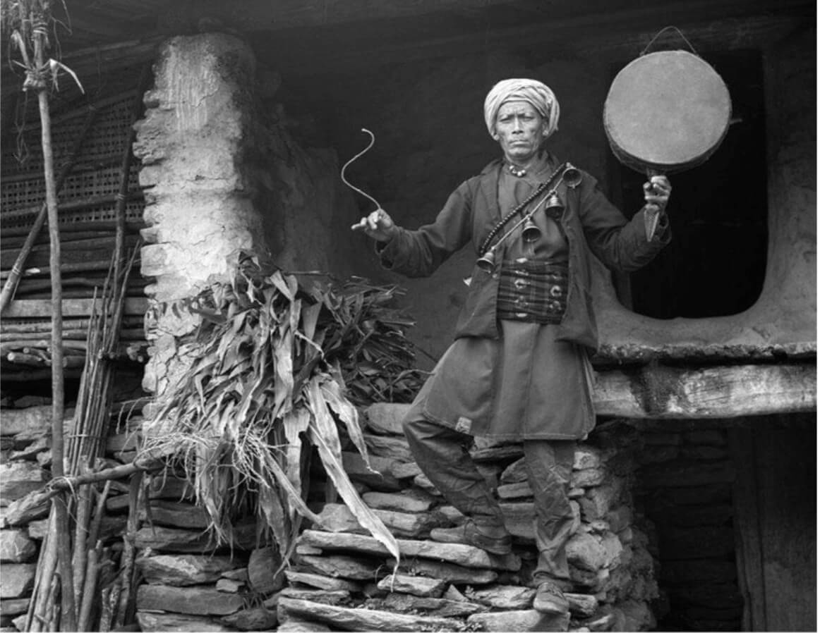 A shaman in Yarsa village of Nuwakot in 1974. Original: Kevin Bubriski