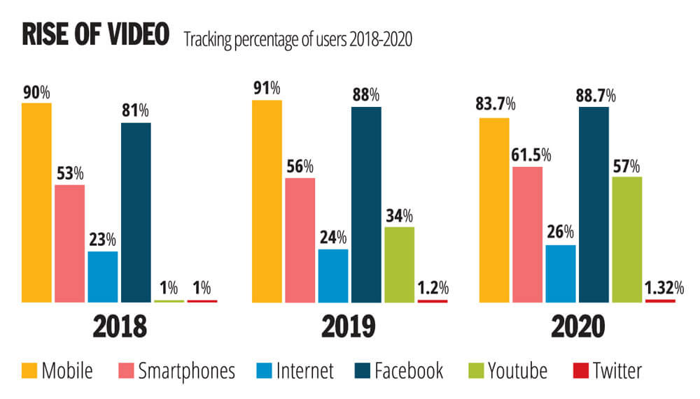 Despite the drift towards the internet, however, the proportion of people who say that they rely on traditional media for national and international news has increased slightly in the past three years. In 2018, 36%, 38% and 4% of respondents said they got their information from radio, television and newspapers/magazines respectively. By 2020, those figures were 45%, 47% and 8%.