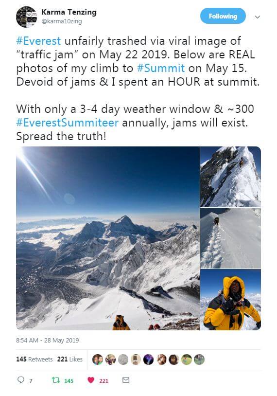 After the news of overcrowding continued to go viral and the mainstream media started picking it up, Tenzing could not bear it any longer and tweeted this again on 28 May: