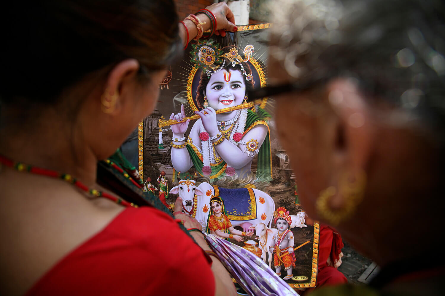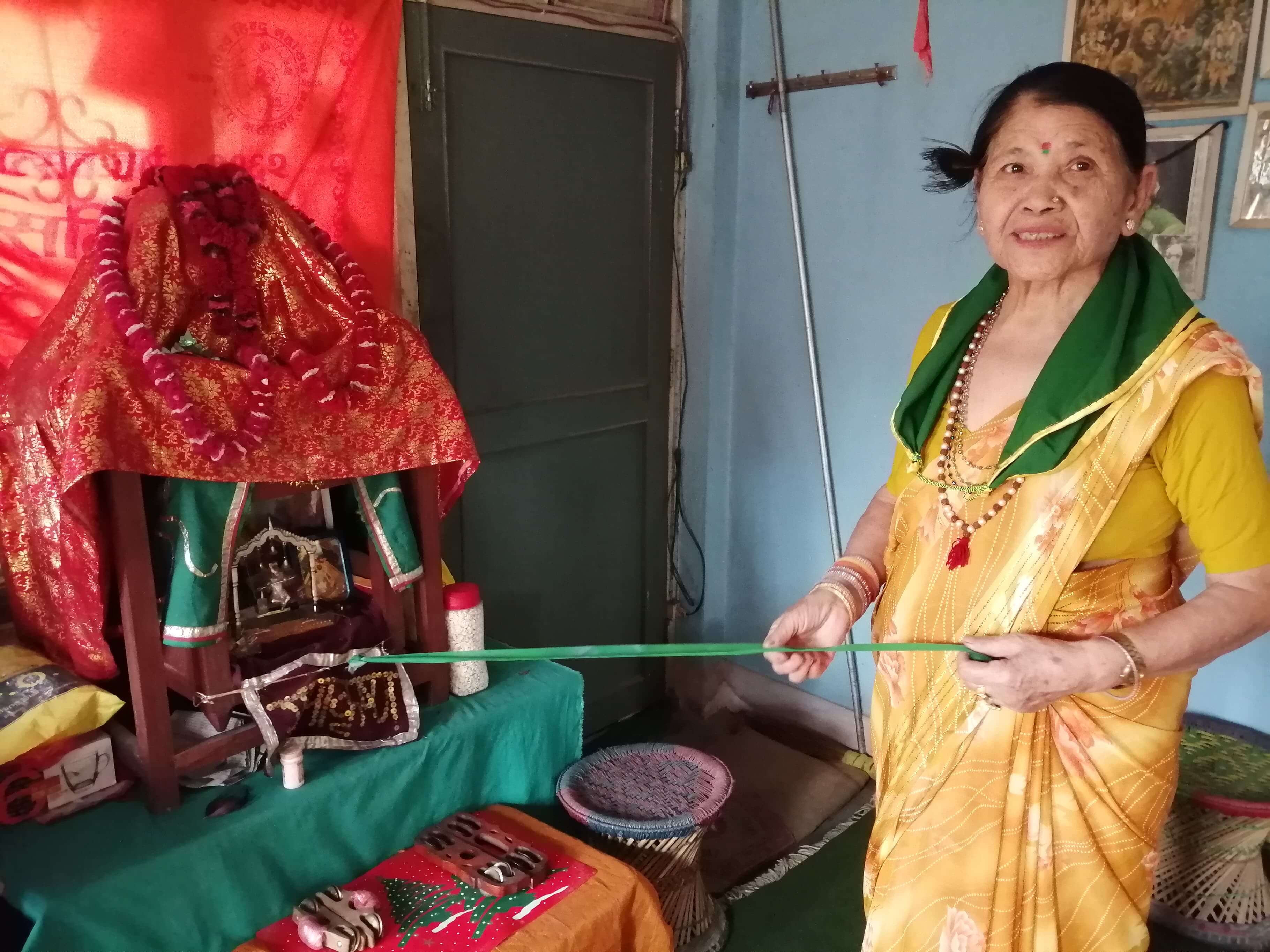 Bhawani KC, 84, fastens a peacock feather in her hair, ties a green scarf around her neck and dons a green tika. She then pulls a green ribbon tied to a tiny swing on which sit silver idols of Krishna and his consort, Radha.