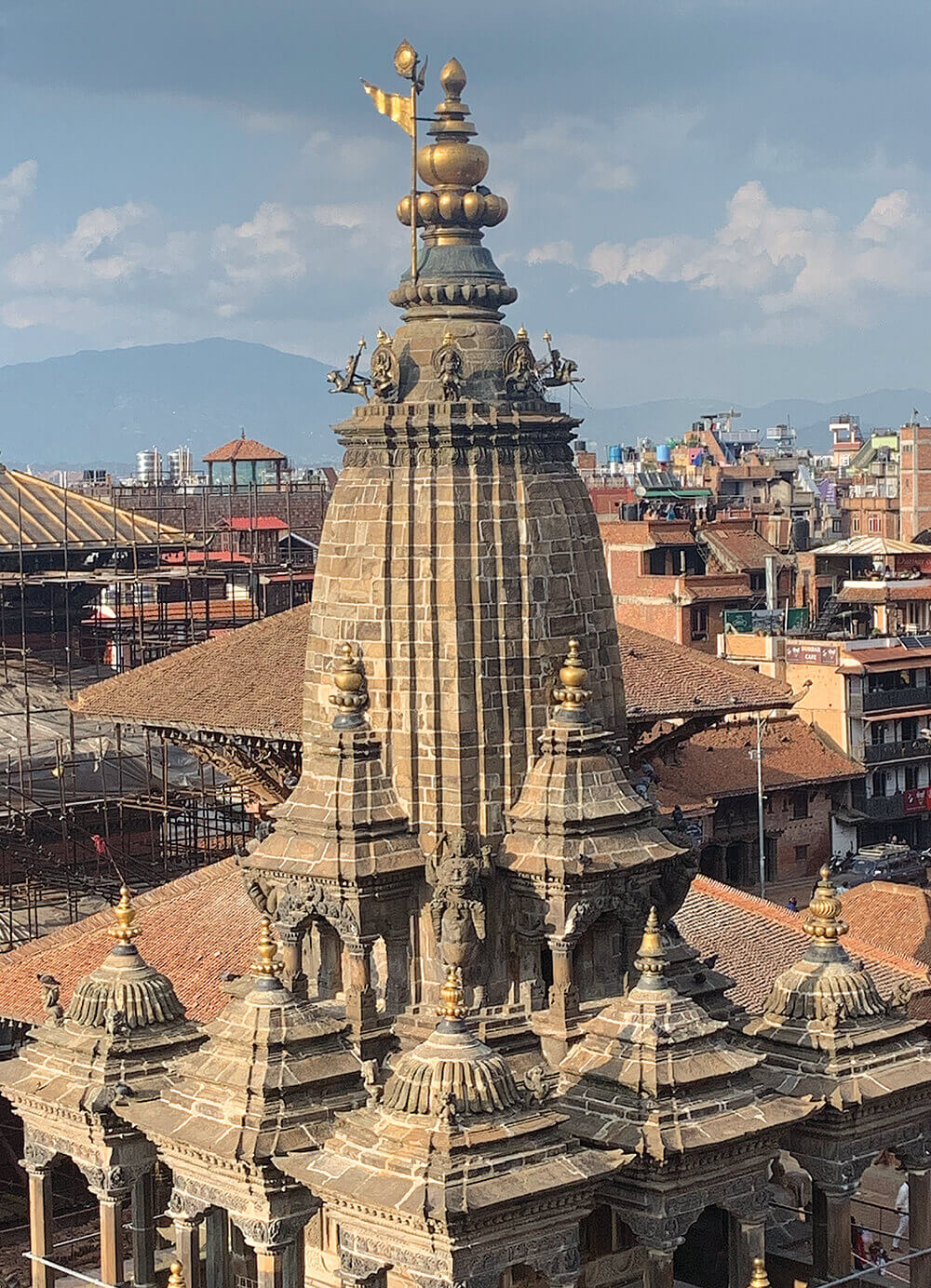 Today the three-storey, shikhar style structure stands in Patan Darbar Square, repaired after structural damage in the 2015 earthquake. Its stone walls and columns are adorned with intricate carvings that depict episodes from the Ramayana and Mahabharata.