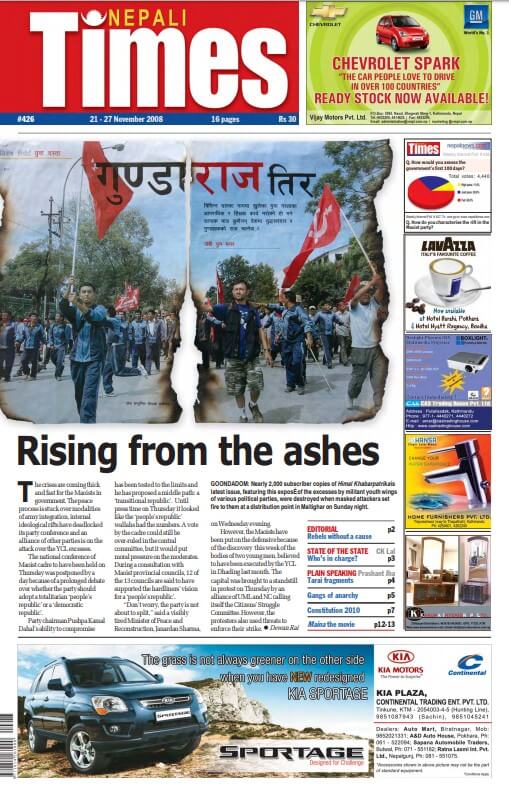 Nepali Times issue #426 of 21-28 November 2008 carried a column by Debi Sunar, the mother of Maina Sunar, 14, who was raped and killed at the Panchkhal barracks of the Royal Nepal Army. She lamented that neither the Army nor the Maoists were prepared to tell her the truth. Her quest for justice for Maina remains unfulfilled to this day. Excerpt: