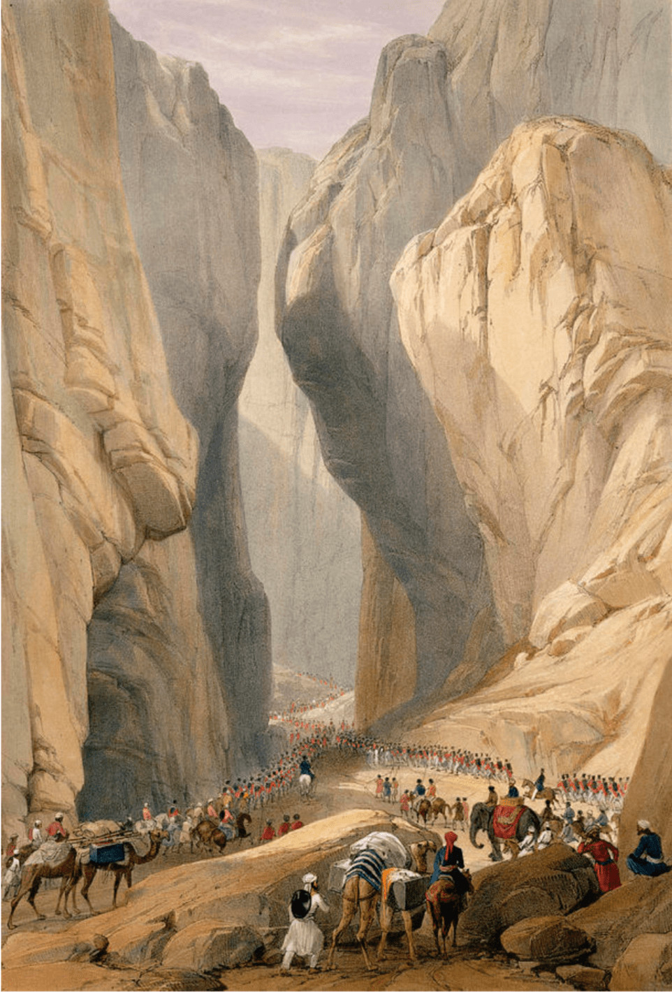 British forces together with Nepali soldiers of the 'Army of the Indus' entering the Bolan Pass en route from Quetta to Afghanistan in 1839. The campaign ended in a bloody disaster. Engraved by Louis and Charles Haghe.