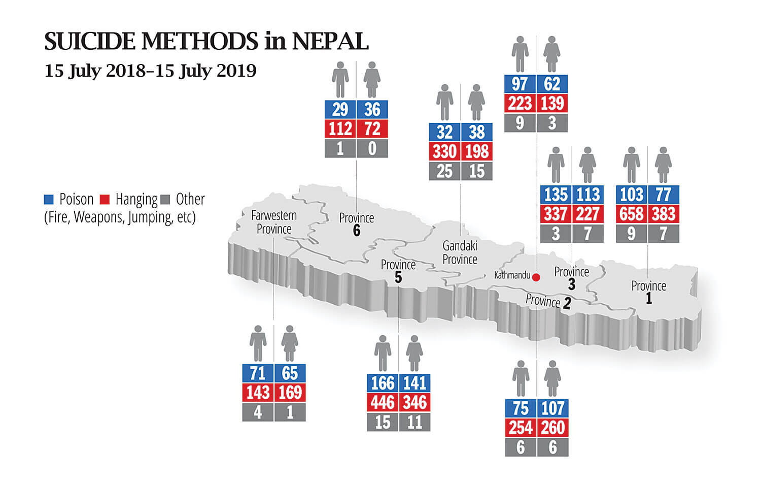 Nepal’s public health system has no mechanism for recording suicides, and the only statistics about suicides can be found in police records. This data shows that about 5,000 Nepalis kill themselves every year.