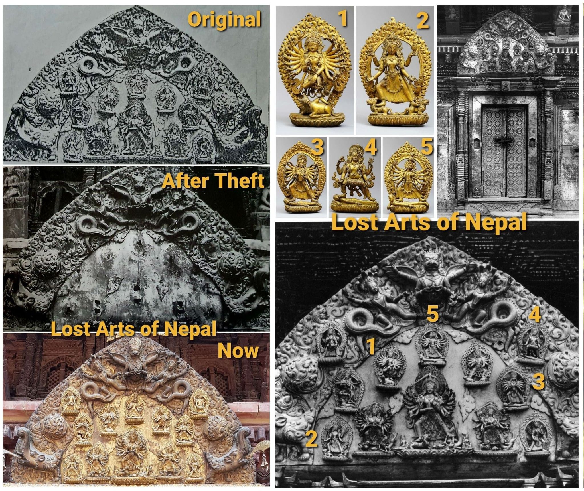 The original gilded bronzes from the torana were first recorded in the early 1970s by Indian art historian BN Banerjee in his book, Architecture of Nepal for the Archaeological Survey of India. Art historian Mary Slusser had also documented pictures of the original statues before they were stolen one by one.
