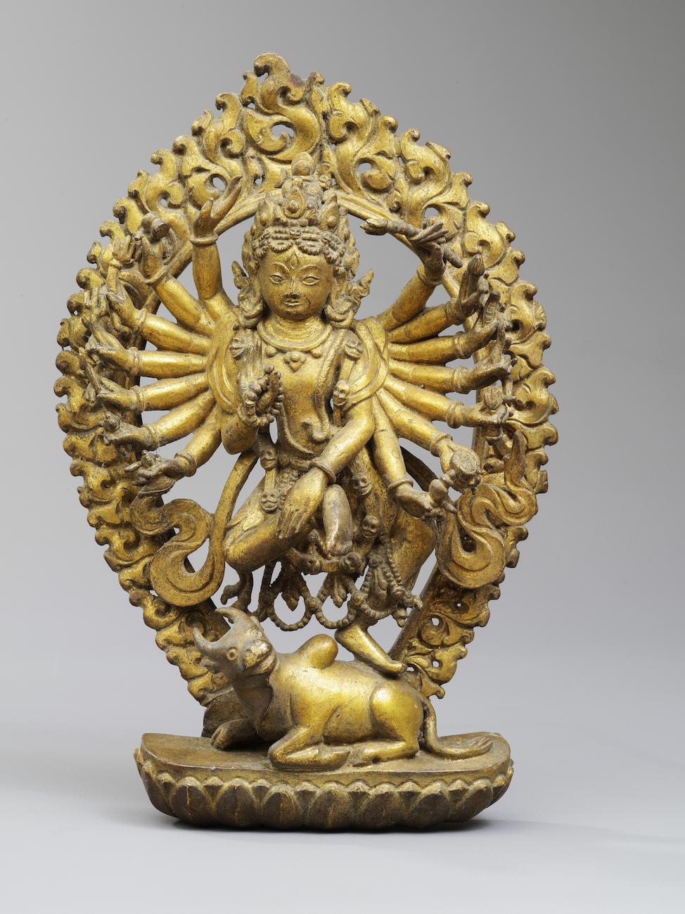 The five gilded copper-bronze images of Nrityanath, Mahalaxmi, Chamunda, Shiva Gana (Bhairab), and Panchmukhi Hanuman (Hanu Bhairab) that were among 12 on a 16th century frieze at the south door of the Mulchok of the Taleju Bhavani Temple in Patan.