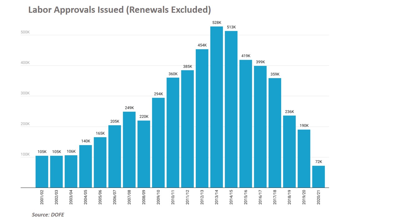 For the first time in two decades, the number of annual labour approvals fell below 100,000 to just over 72,000 in 2020-21. This drop reflects the shrinking opportunities for Nepali job seekers who have relied on migration to break out of intergenerational poverty.