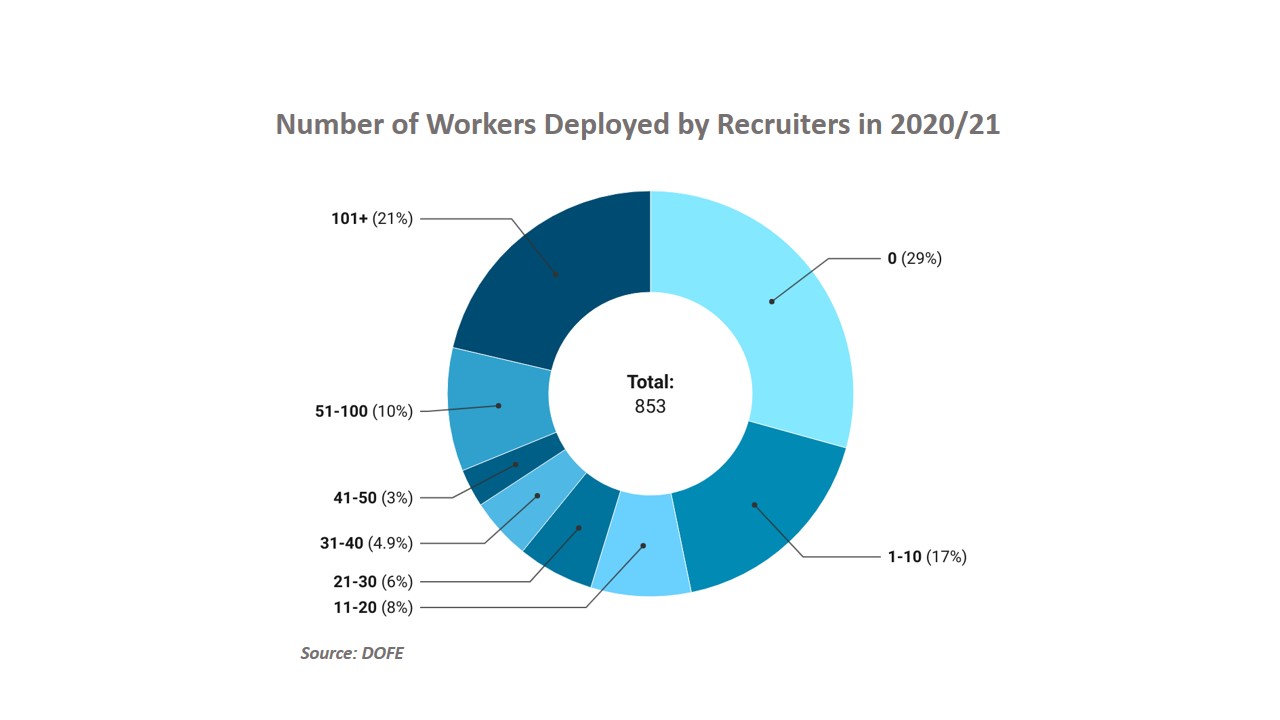 Recruiters complain that the government has not acknowledged their contributions or the impact of Covid-19 on their businesses. Last fiscal year, almost a third of the 853 recruiters in Nepal were unable to obtain labour approvals for a single worker, while about a fifth deployed less than 10 workers over the entire year (See figure).