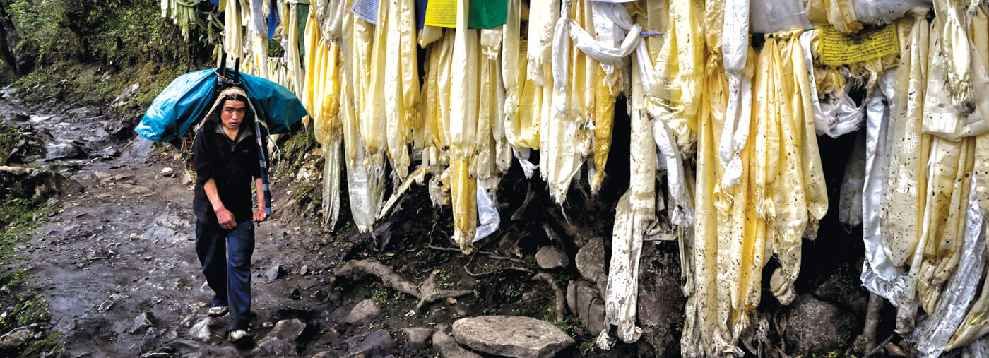 Afraid of being grounded in Lukla by weather last year, he decided to walk down to Phaplu as the monsoon broke over the Himalaya. The photographs of the less-travelled trail with mule trains, school children and porters carrying enormous loads of corrugated sheets along shiny rain-soaked stone paths take us back to a pre-tourism Solu Khumbu.