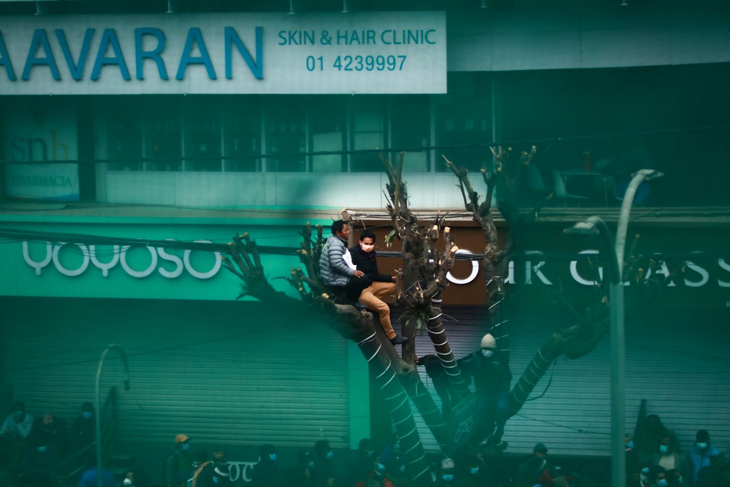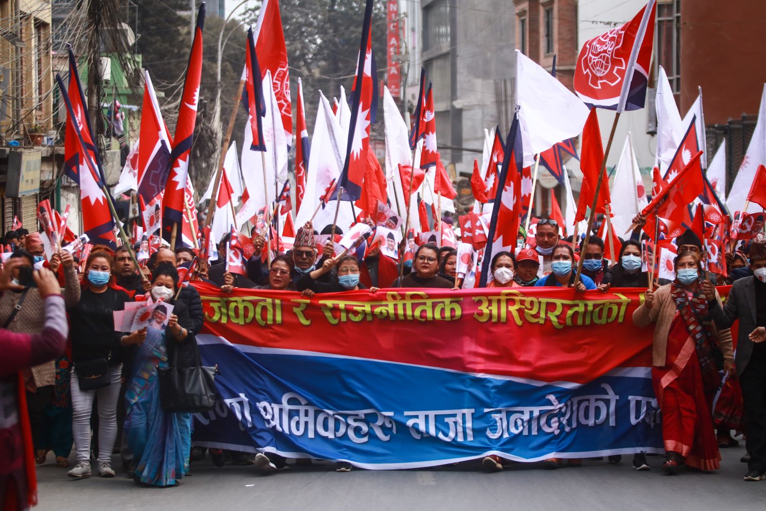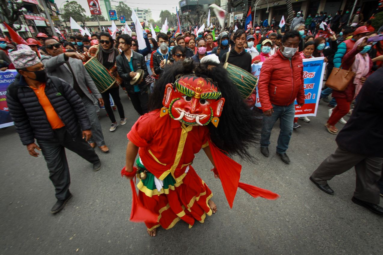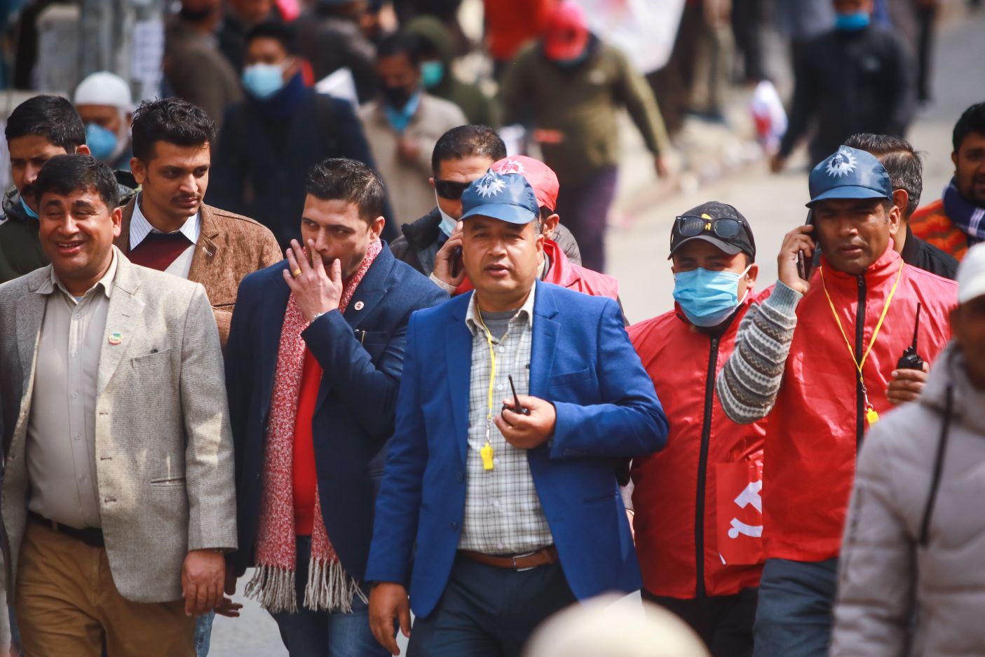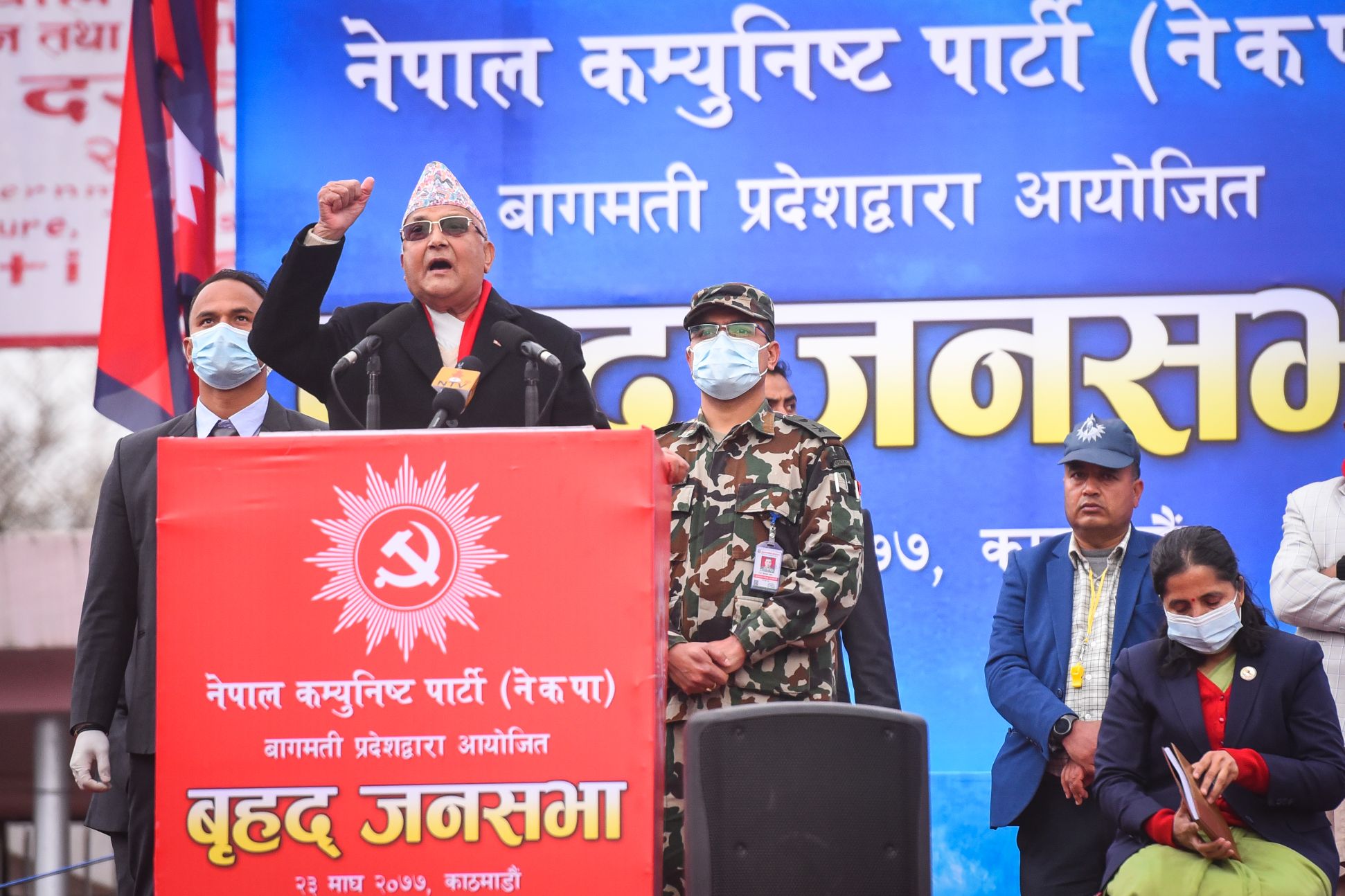 Prime Minister Oli’s supporters appeared to be promoting a cult of personality around him, with a huge cutout of him above the stage, posters bearing the prime minister’s visage on every streetlamp post on Darbar Marg, and even a helium balloon with the party flag and Oli’s portrait on it. This invited comparisons on social media to King Gyanendra’s desperate attempts to hold on to power in 2006.