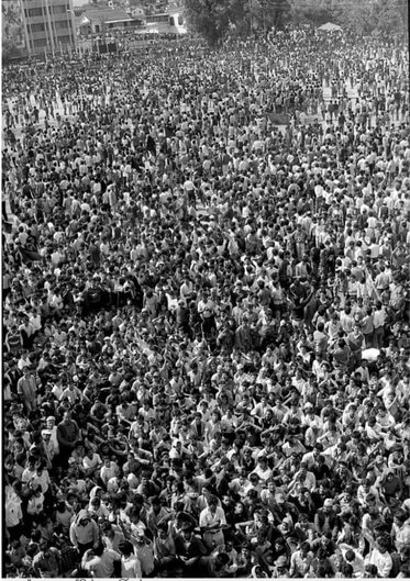 There was a victory rally at the Khula Manch, the formerly underground leaders like Krishna Prasad Bhattarai, Ganesh Man Singh and Man Mohan Adhikari were on stage. As Bhattarai gave a rousing speech, Bajracharya noticed a young student spring up from the crowd, he turned his camera away from the podium to her and took a couple of photographs.