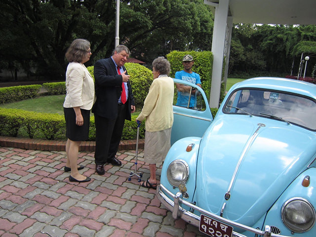 Elizabeth Hawley with the famous Blue VW Beetle, andUS Ambassador Peter and Tanya Bodde.