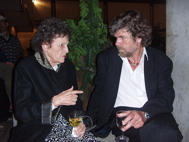 Photo: Lisa ChoegyalElizabeth Hawley with mountaineering legend Reinhold Messner.