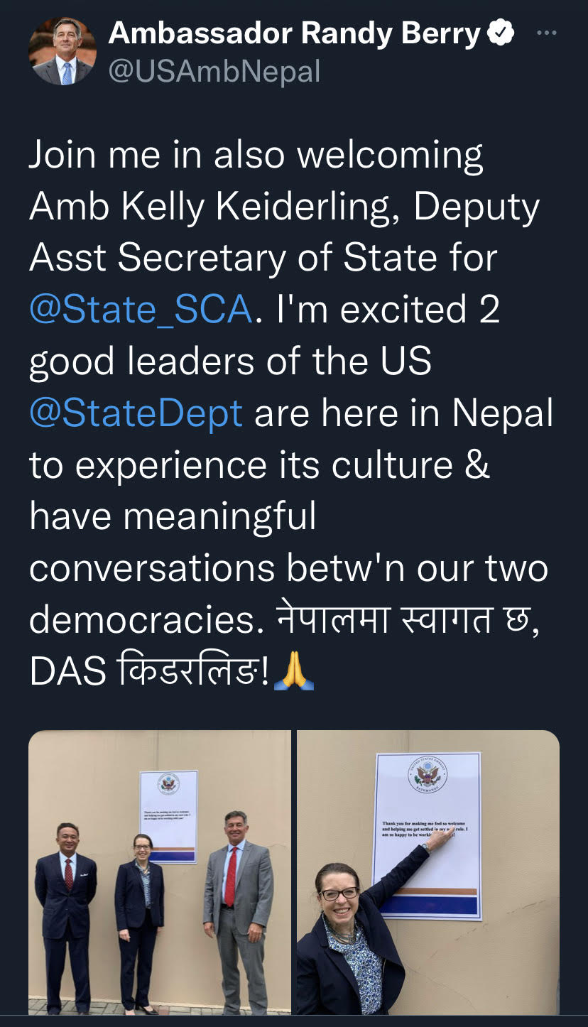 The US Assistant Secretary for South and Central Asian Affairs Donald Lu and his deputy Kelly Keiderling are both in Kathmandu this week to meet Prime Minister Sher Bahadur Deuba and other leaders. These visits follow a 4-day trip in September by Fatema Z Sumar, Vice President of Compact Operations at the MCC.