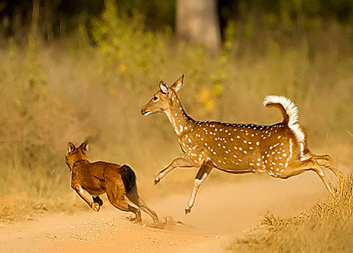 Like most canine species, the Asiatic Wild Dog is known to form social packs of up to 35 individuals, providing them a distinct advantage over larger carnivores like the leopard or tiger, which have superior hunting skills but stalk prey alone.