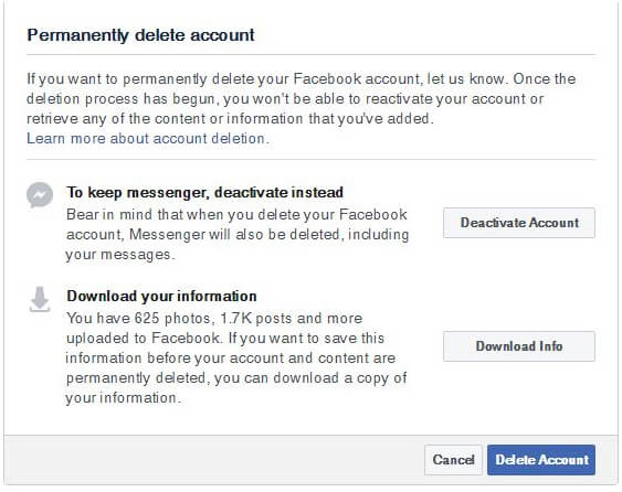 You can either deactivate your Facebook account, or delete it. Deactivating means people cannot find you, and you can still come back and Facebook will have saved your content. Deleting is irreversible, but takes a few days for your page to stop appearing, and up to 90 days for FB to dump your content, but your messages will still remain.