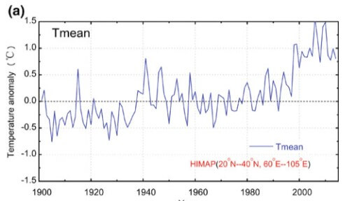 Annual mean temperature anomaly in the Himalayan region in the past century, showing sharp warming trend.