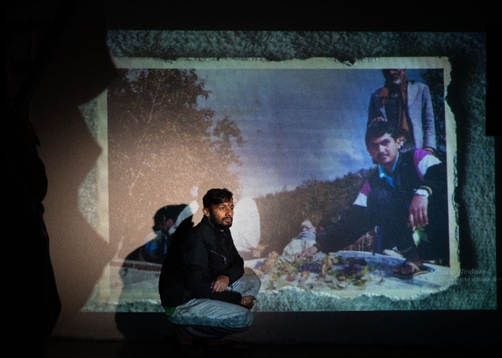Bibek poses for a portrait alongside a photo of his father Rajendra Prasad Dhakal projected to the wall behind him. He was only nine months old when his father was disappeared in 1999. "Sometimes, when I smile or sing out loud, my mother tells me that I look just like my father," Bibek says.