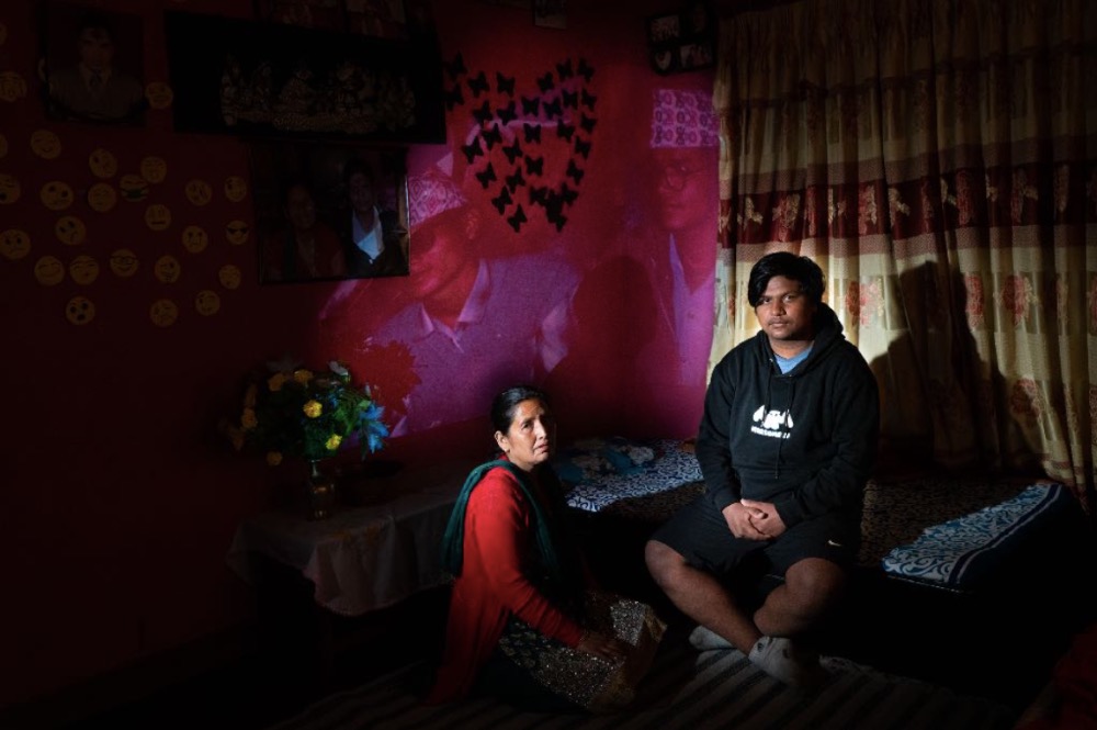 Maina Karki and her son sit in front a picture of her late husband, who was a sociology teacher in a government school. He was detained twice by Maoist guerrillas for refusing to give them a donation, and killed the second time. The police report said he has been shot four times.